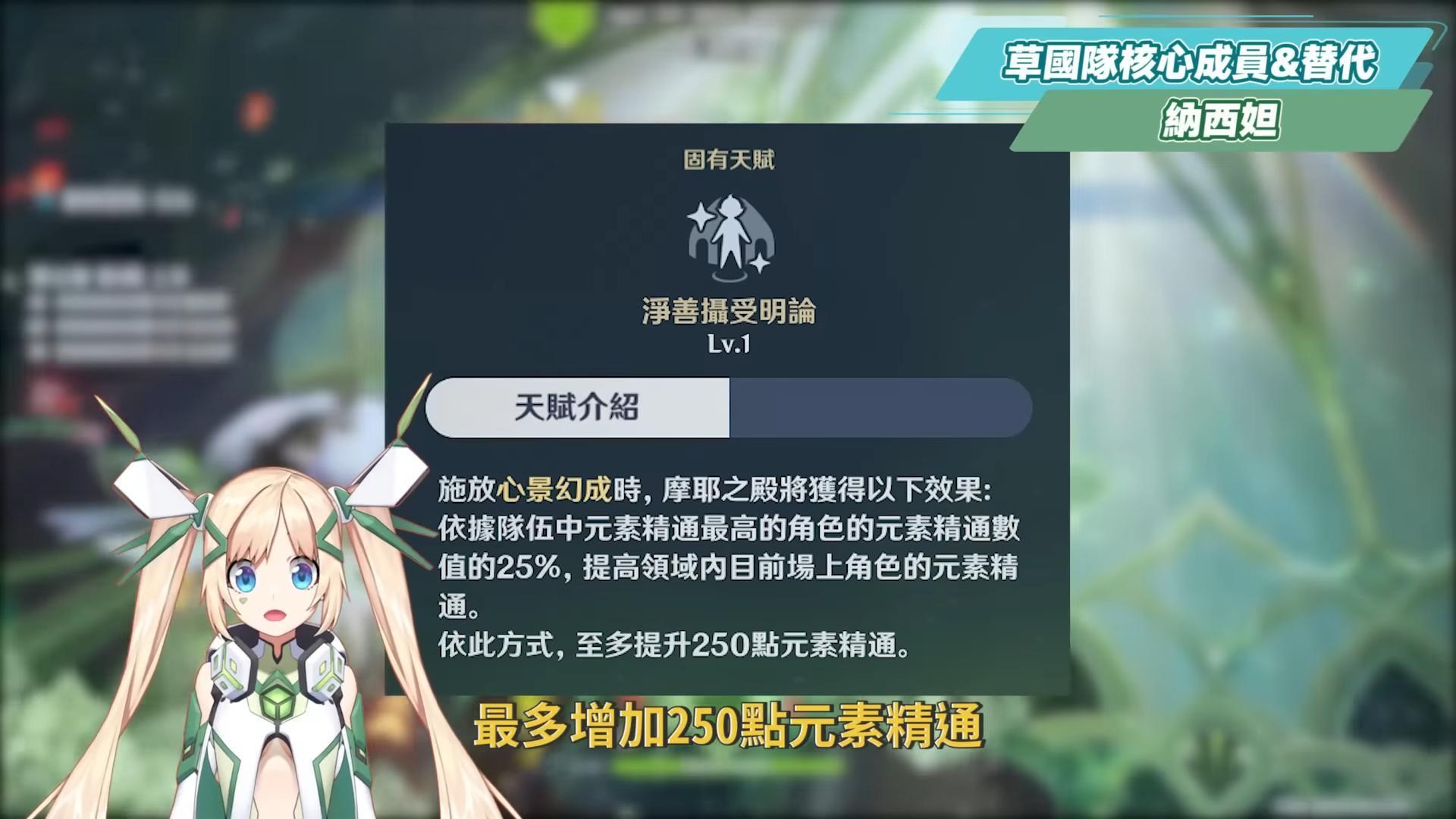 納西妲作為草元素反應的核心,大招可以提供領域內場上角色最多增加250點元素精通,有專武千夜浮夢的話還能提供更多,同時自身又是一名可以提供傷害的副C角色,搭配2命效果更可以讓超綻放的傷害有機率吃暴擊直接翻倍,並且E技能的蘊種印可以一次鎖定多名敵人,少去聚怪的心力,而納西妲除了轉後台當副C或工具人之外,也可以轉為前場打蔓激化的站場C,可以說是相當關鍵又靈活的角色,若是沒有草神要替換的話,比較類似定位的會是草主。實戰中納西妲的E元素戰技所附著的草元素量也是特有的中草元素附著,加上草神站場A的話能夠完全蓋過水元素,因此就能讓敵人的原激化狀態持續時間延長,同時搭配行秋的減傷、抗打斷、微量回血以及久岐忍的E技能持續回血,若不是受到瞬間爆發傷害的話,是很不容易死的。行秋