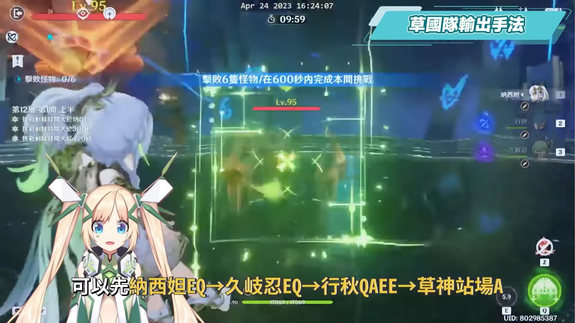 再來就是說明一下關於草國隊的輸出手法,可以先納西妲EQ→久岐忍EQ→行秋QAEE→草神站場A,直到行秋Q和久岐忍E消失後再重新循環的方式,如果是還沒解鎖2命的久岐忍,納西妲後可以先開Q,E接在行秋之後,再接草神站場就能對上行秋技能時間。而如果第四人有搭配站場主C,大方向上也是接在行秋之後的站場,變成有點像是草國武裝的感覺,不論是搭配綾人、賽諾、艾爾海森大致上都差不多,輸出過程其實非常順手,傷害又很不錯。