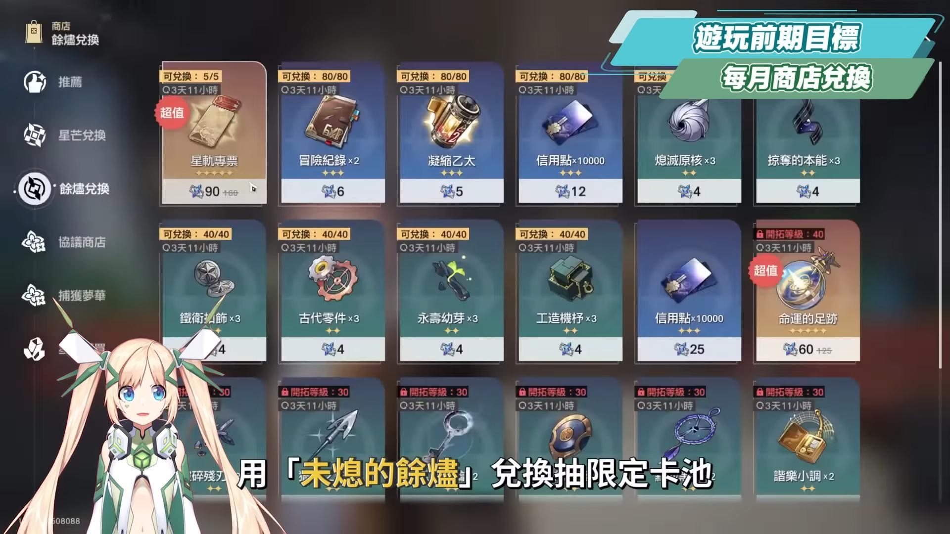 遊玩到這邊差不多解鎖了主要的每周必做以及每日必做的事項,這邊也再提醒一下每月商店兌換的部分,由於開服日是4/26,已經將近月底了,要記得在月底前到餘燼商店,用「未熄的餘燼」兌換抽限定卡池和常駐卡池的星軌專票和星軌通票。剩下的目標就是一樣優先解主線解到不能再解,運用每天的體力去換素材培養角色,以及屯星瓊抽角色,真要說肝的部分老實說也只有開服前面的1~3天,後續的內容都可以交給2倍速自動戰鬥以及提升練度,等到解鎖後續的「忘卻之庭」,才會需要開啟更高難度的挑戰,後面的時間主要都是花在養成上,關於忘卻之庭後面洛洛也會再製作影片,提供給萌新們認識玩法與提供配隊方向。