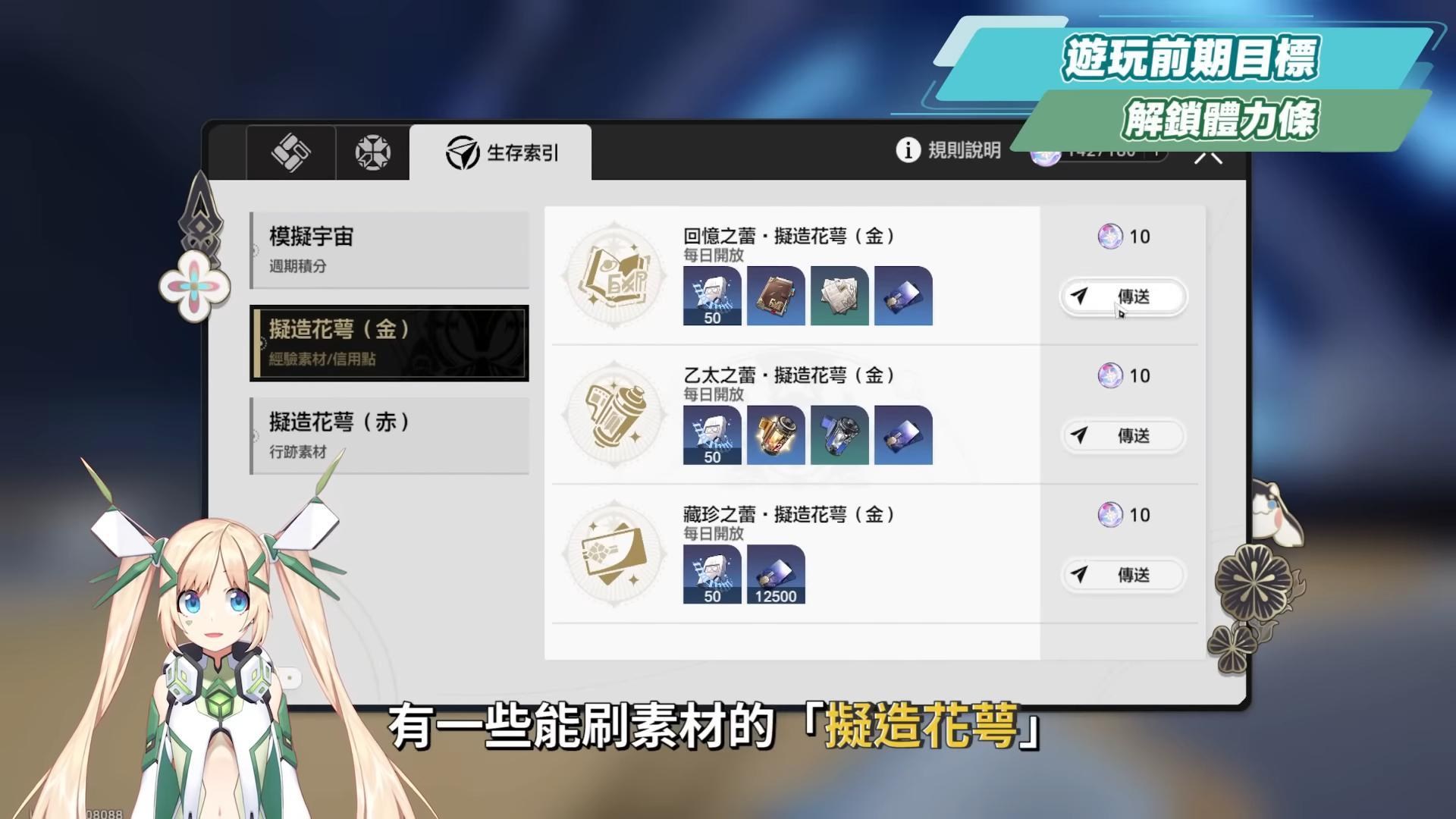 解鎖模擬宇宙後下一步可以再繼續推主線,而如果你的開拓等級已經來到7等左右就可以解鎖體力條,每6分鐘回1點,上限為180,大概來到第一個「雅利洛」星球時,有滿體力強迫症的客家人可以先找找看地圖上有一些能刷素材的「擬造花萼」,小刷個幾場讓體力不要滿出為主通常一開始比較缺的會是經驗書,接著再繼續推主線,而如果是下線長時間不玩遊戲的話再記得把體力清空就好。解鎖每日實訓&派遣