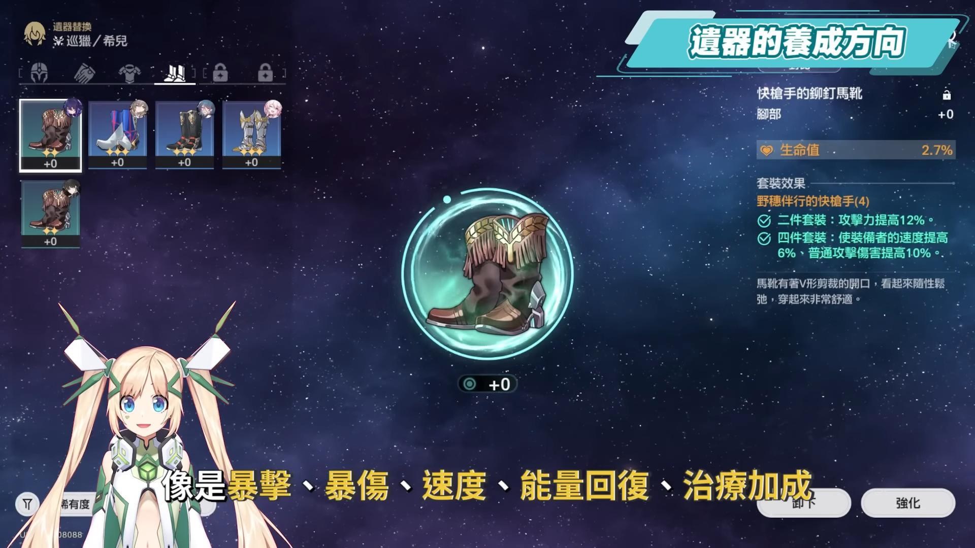說完光錐再來說關於遺器的養成,由於前面主要都是用四星遺器為主,但遊戲玩到後期也是會慢慢汰換成五星遺器的,這點有玩《原神》的老玩家就會相當熟悉,所以這邊也要提醒萌新前期不要太著急想去刷更好的四星遺器詞條,可以把目標放在開拓等級40等(公測後條件下調)後,到時候能在「侵蝕隧洞」中花費40體力必定刷出金色的五星遺器,前期也不需要硬湊套裝效果,只要主屬性對的遺器就可以先用,一些比較特定效果的主屬性遺器也可以先留,像是暴擊、暴傷、速度、能量回復、治療加成、效果命中、擊破特攻、屬性傷害提升的這種,都算是比較稀有的主屬性,所以也可以先留著或是先鎖定,後面有需要時再強化,其次再追求輸出向的2件套套裝效果,最後再慢慢去湊成套,這也是最考驗玩家耐心的一個部分,也會花費非常大量的期望天數在這上面。