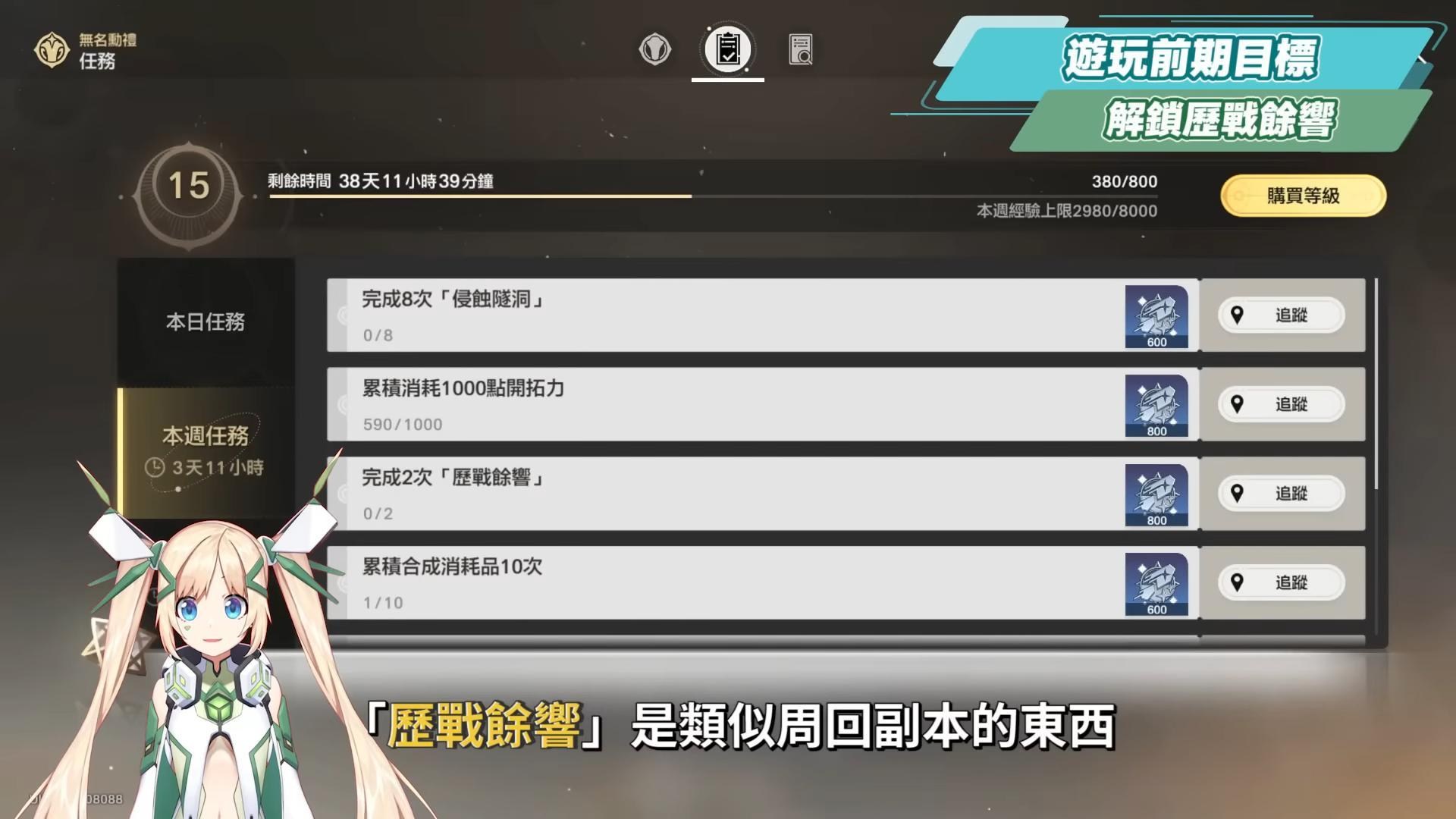 「歷戰餘響」是類似周回副本的東西,每周有限定的刷取上限次數,並且裡面掉落的素材也是比較稀有的,這周沒刷就等於少別人一周的稀有素材,所以第一周的目標也最好先把歷戰餘響開出來,進度上大約在解完雅利洛星球的主線劇情,打完可可利亞後就能解鎖,玩到這邊的遊戲總時數大約會落在8~10小時左右,因此也可以大致分配一下自己的每日遊戲時數,看能不能最慢在周日前解鎖到。每月商店兌換