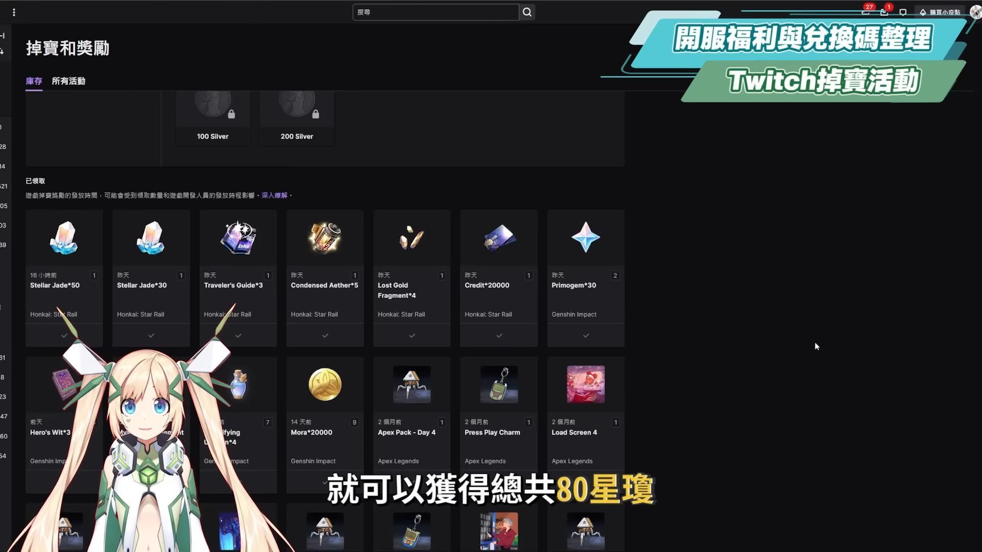 在Twitch也有相關的免費星瓊掉寶領取活動,只要到Twitch上點擊自己的頭像選擇「掉寶」進入後,連結自己的米哈遊通行證,接著掛在有《崩壞:星穹鐵道》的直播頻道上,就可以累積掉寶進度,大約需要掛滿5個小時左右,就可以獲得總共80星瓊和一些其他的素材獎勵。有時候洛洛也會在Twitch邊開遊戲邊工作,一邊讓大家領掉寶,所以在5/24前也可以來洛洛的Twitch頻道領個免費星瓊囉!