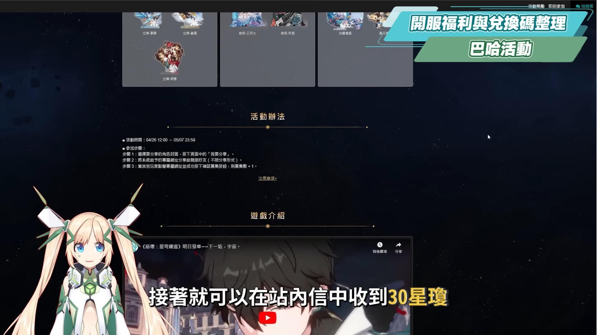 巴哈網頁上也有一個追蹤分享活動,進入網頁後可以點擊按鈕追蹤《星穹鐵道》FB官方粉絲頁,接著就可以在站內信中收到30星瓊和一些素材獎勵的新手禮包內容,下方也有一些實體獎勵的分享活動,有興趣的也可以參考。