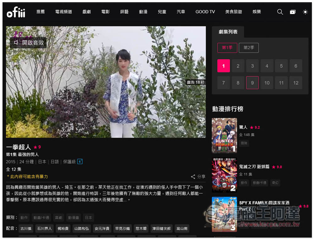 每部影片內頁也都有簡單的介紹描述,目前只有影片開頭有 20 幾秒的廣告,其他地方都沒有廣告,用起來非常舒服。而影片如果有分集數和季數會顯示在右側:
