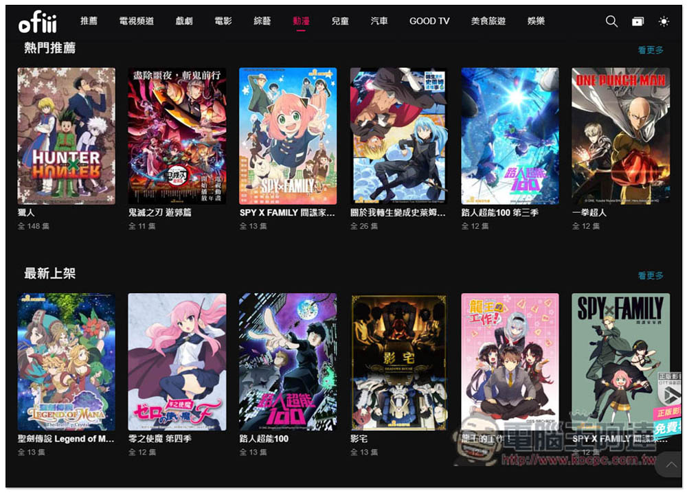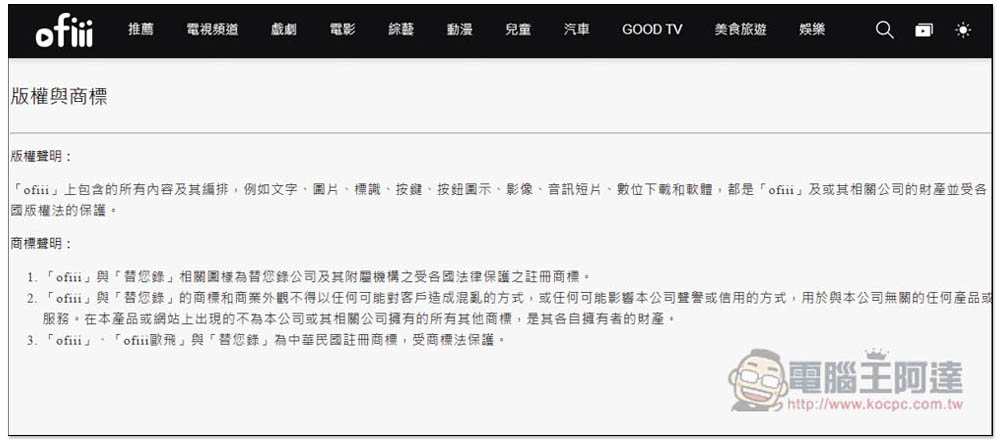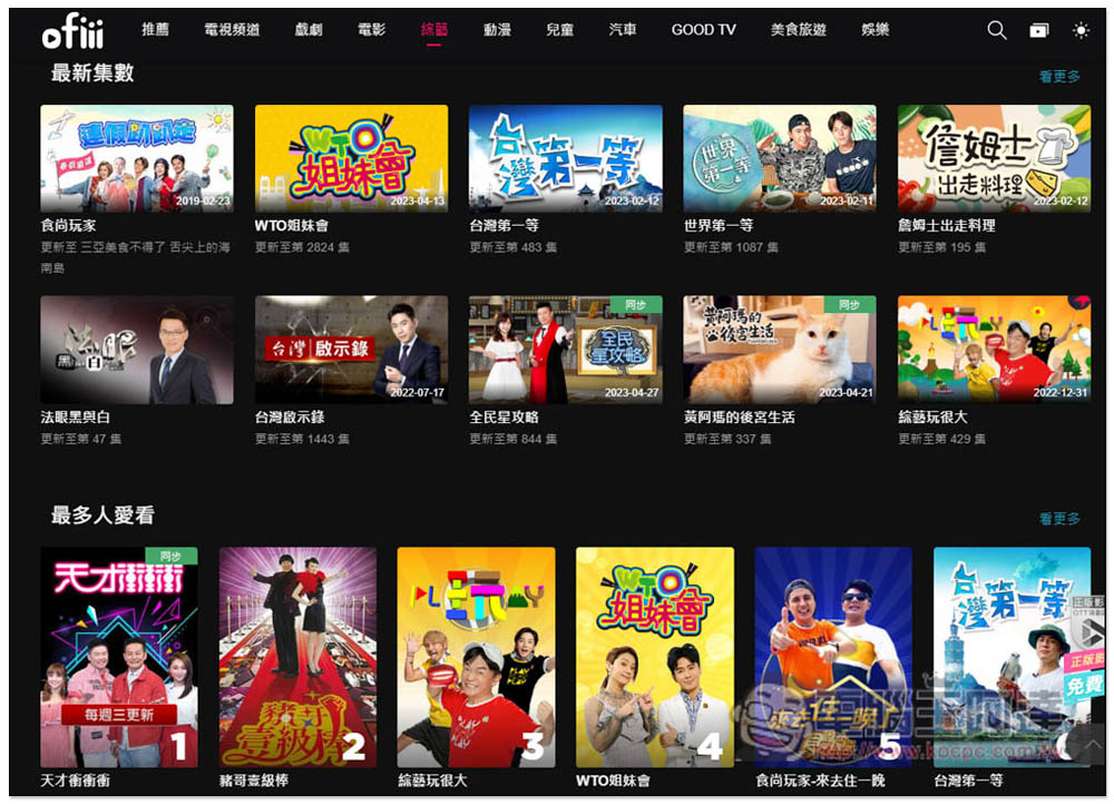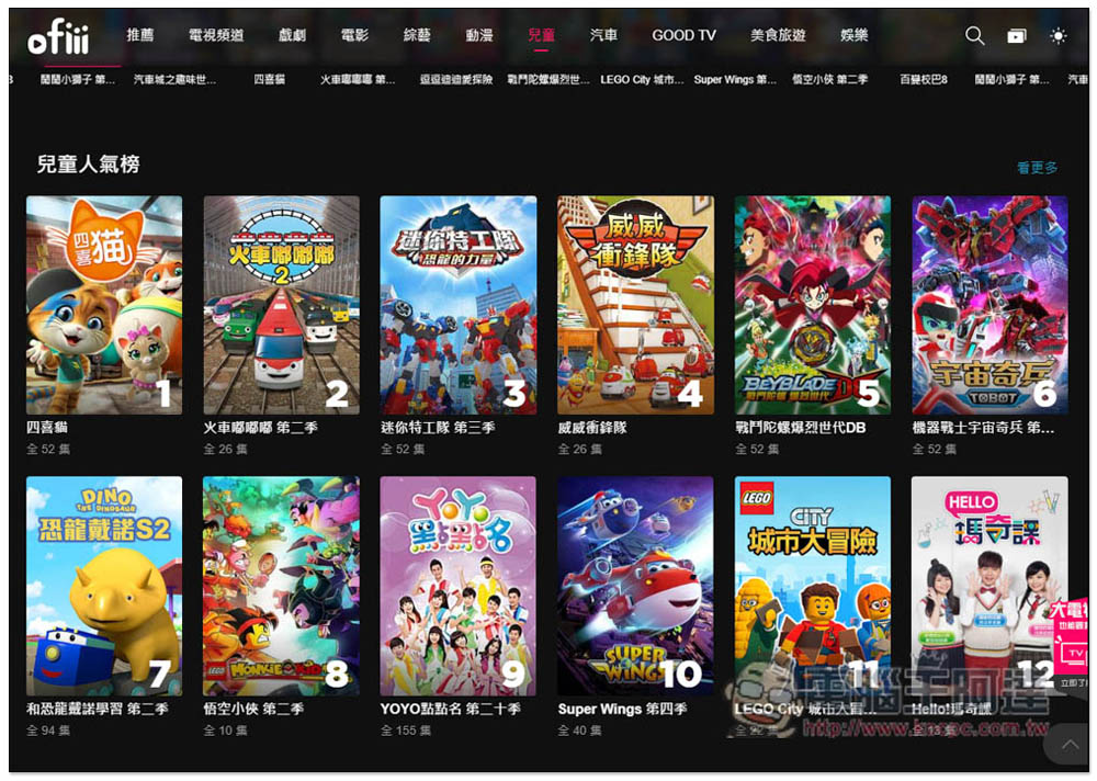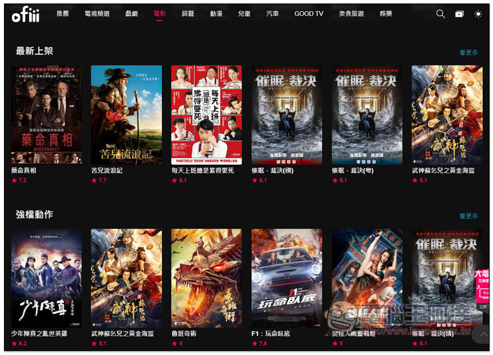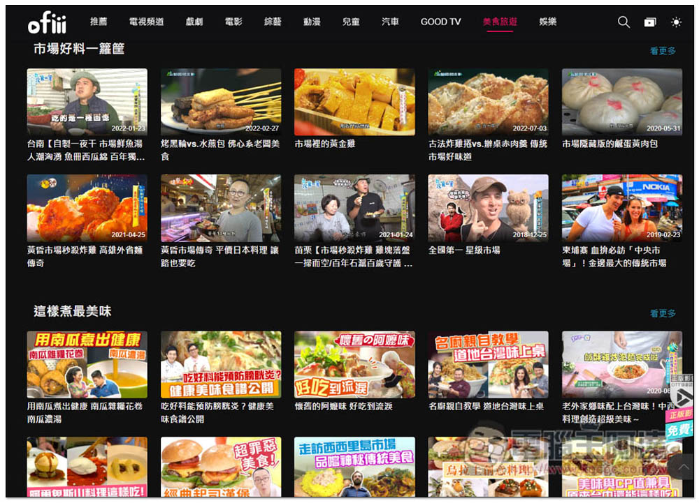 「ofiii 歐飛」網站設計就跟大多數影音平台一樣,最上方為完整分類,目前共有 10 大類,電視頻道、戲劇、電影、綜藝、動漫、兒童、汽車、GOOD TV、美食旅遊、娛樂。