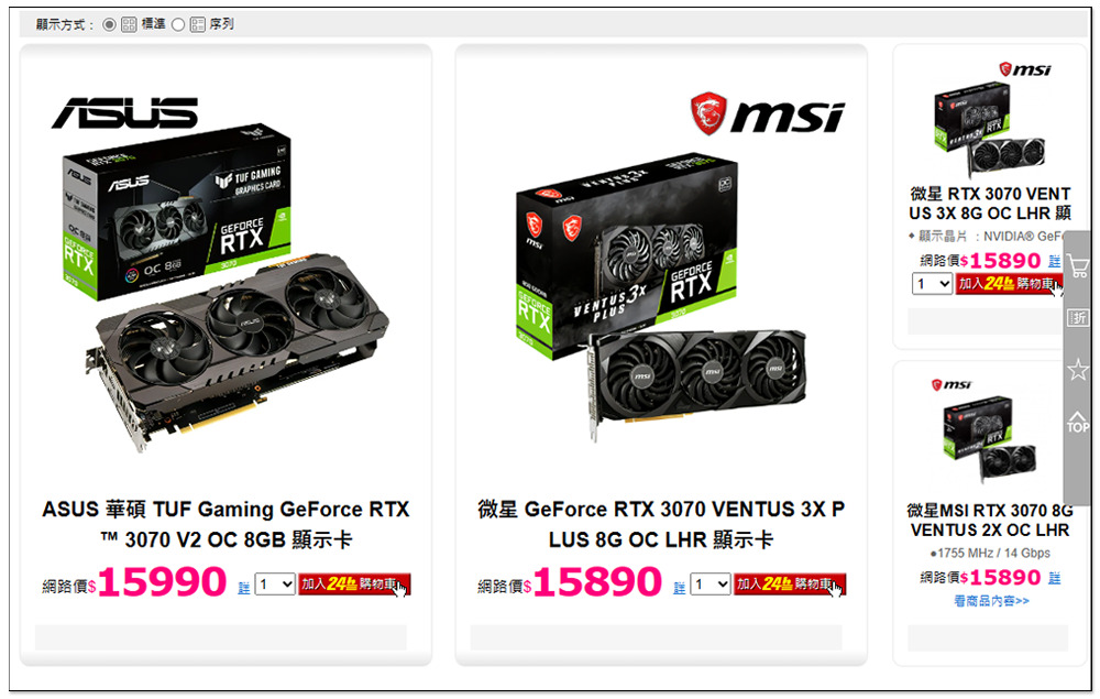 台灣部分也一樣,GeForce RTX 3070 建議零售價為 NT$15,900,現在在 PChome 24h 購物和 momo 購物網,都可以找到微星 GeForce RTX 3070 VENTUS 3X PLUS 8G OC LHR 只需要 NT$15,800,便宜 NT$100,ZOTAC 的更便宜,但目前台灣似乎沒有太多庫存,比較難找到: