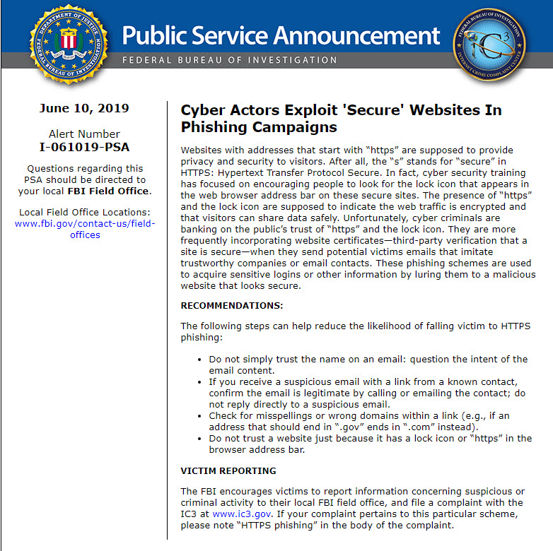 只是HTTPS著重傳遞內容加密的安全性,常被擴大視作網站內容本身就是安全的,但其實包含FBI在內都在提醒使用者,許多的網路釣魚或詐騙網站也都使用HTTPS,但網站內容或各種操作步驟反而是有害的。