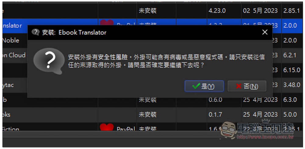 打開使用者的外掛視窗後,第二個就是 Ebook Translator,請點擊它並按下方的安裝: