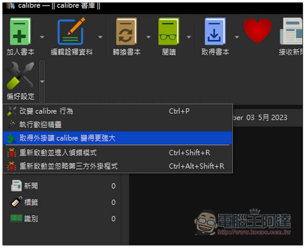 這邊我示範從 Calibre 的外掛功能中安裝,點擊偏好設定右邊的倒三角形圖示,就會看到「取得外掛讓 Calibre 變得更強大」選項: