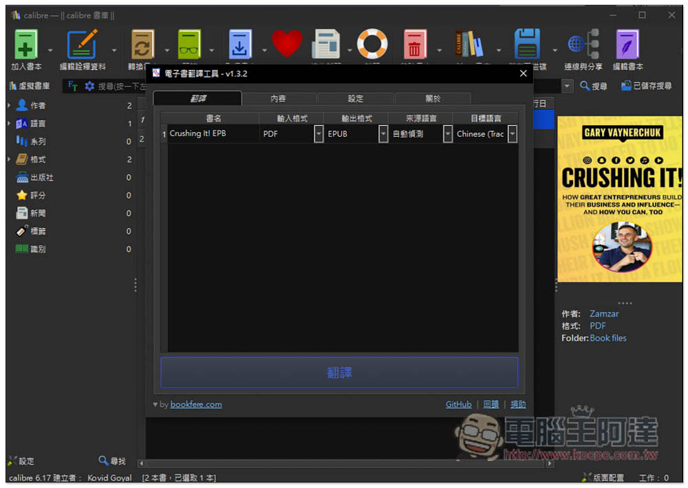 重啟完成後,在上方列表中就會看到新的「翻譯書籍」圖示,這時請先點選你要翻譯的國外電子書,然後再按翻譯書籍: