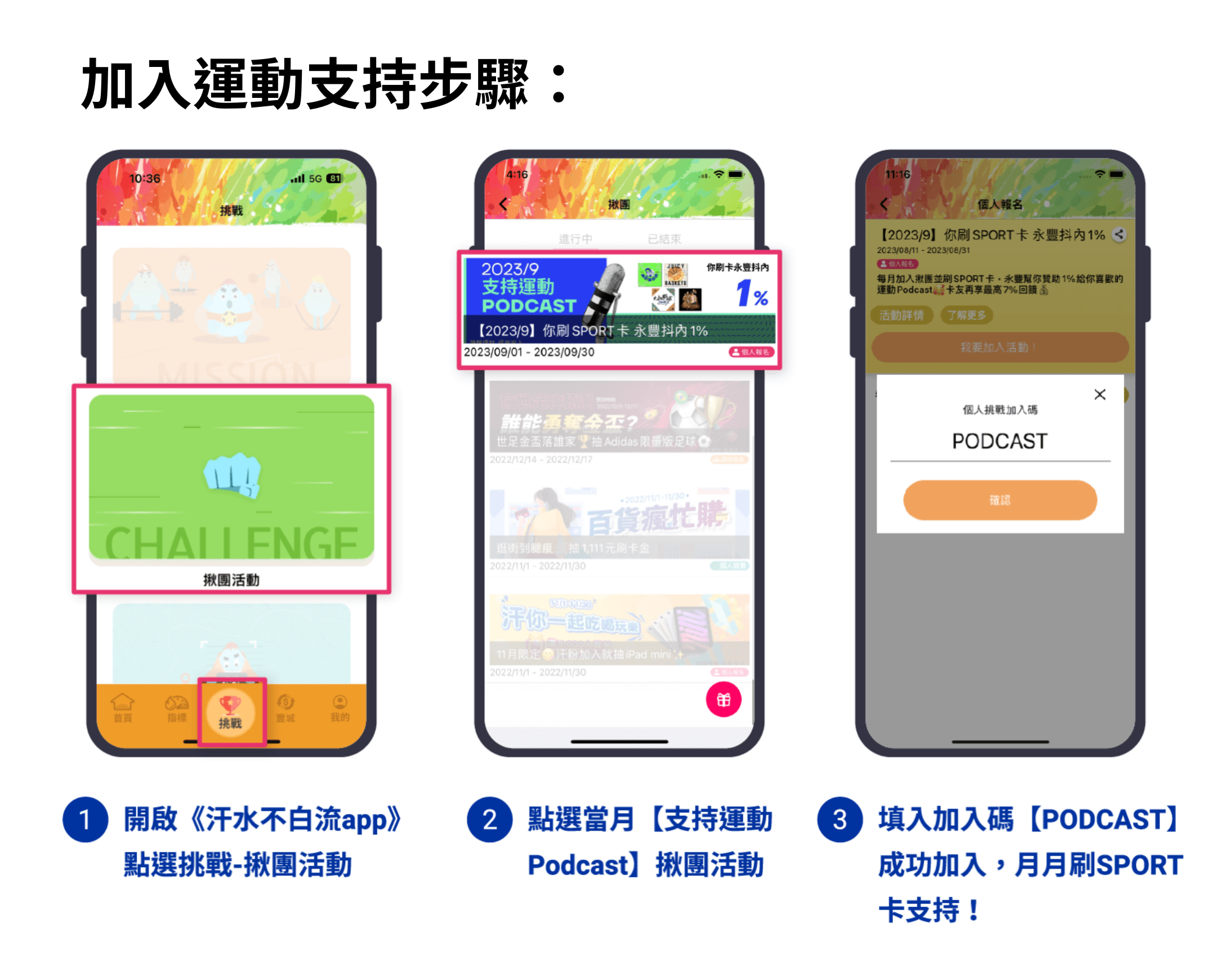 活動內容:每月加入《汗水不白流app》【支持運動Podcast】揪團活動,永豐銀行將以永豐SPORT卡卡友報名當月之一般消費1%計算「運動支持」款項(正附卡合併計算,上限50元/月),贊助活動合作Podcast頻道。