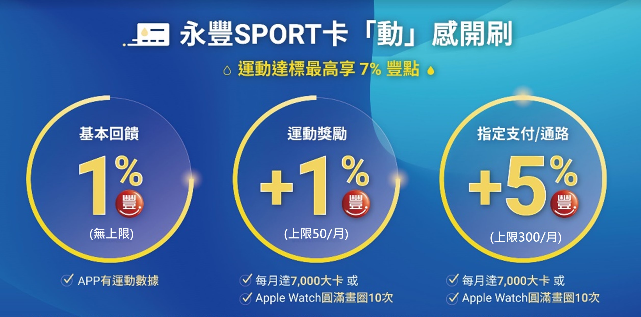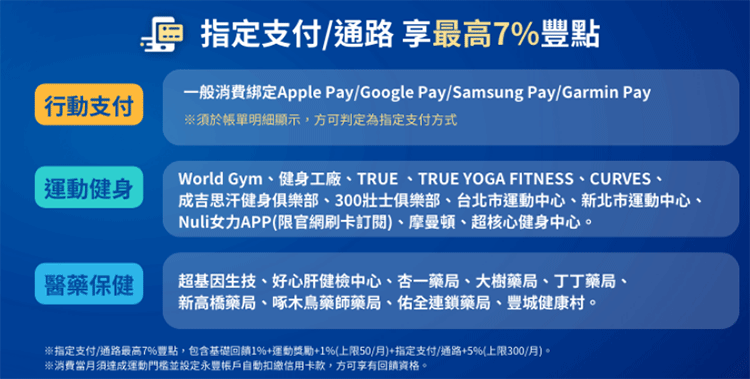 ※運動獎勵及指定支付/通路加碼回饋,需於消費當月於《汗水不白流APP》達10,000大卡或Apple Watch圓滿畫圈10次,並於消費次次月初回饋前設定永豐帳戶自動扣繳信用卡帳款方可享有加碼回饋。