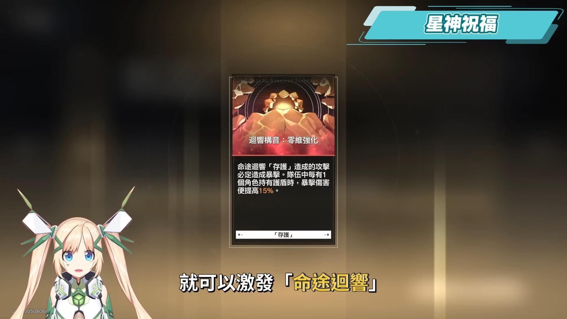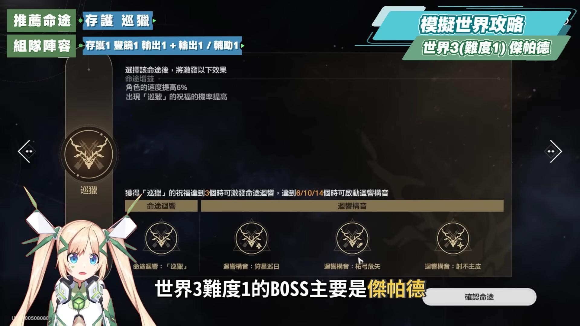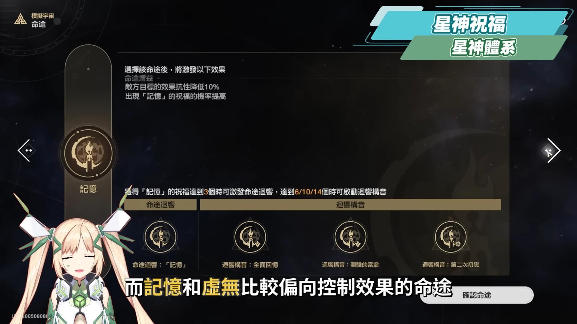 在模擬宇宙中的祝福都會被分類在七種星神的命途中,在進入模擬宇宙前會先選擇一個星神的主要命途,以便激發主要效果,還有後續關卡中出現該命途祝福的機率,像是存護命途可以提升角色獲得的護盾量、記憶命途可以使敵方目標的效果抗性降低10%、虛無命途可以使角色造成的持續傷害提高15%、豐饒命途可以使角色的恢復量提高10%、巡獵命途可以使角色的速度提高6%、毀滅命途可以使角色受到的傷害降低6%、歡愉命途可以使角色的追加攻擊造成的傷害提高24%,而此外在關卡中只要蒐集到3個主要命途的祝福,就可以激發「命途迴響」,而後續再總計獲得6個或10個時,還可以再額外解鎖「迴響構音」,依照隊伍的特性選擇不同的命途,再搭配奇物的效果,可以組建出許多不同的流派玩法,這也是模擬宇宙有趣的地方。