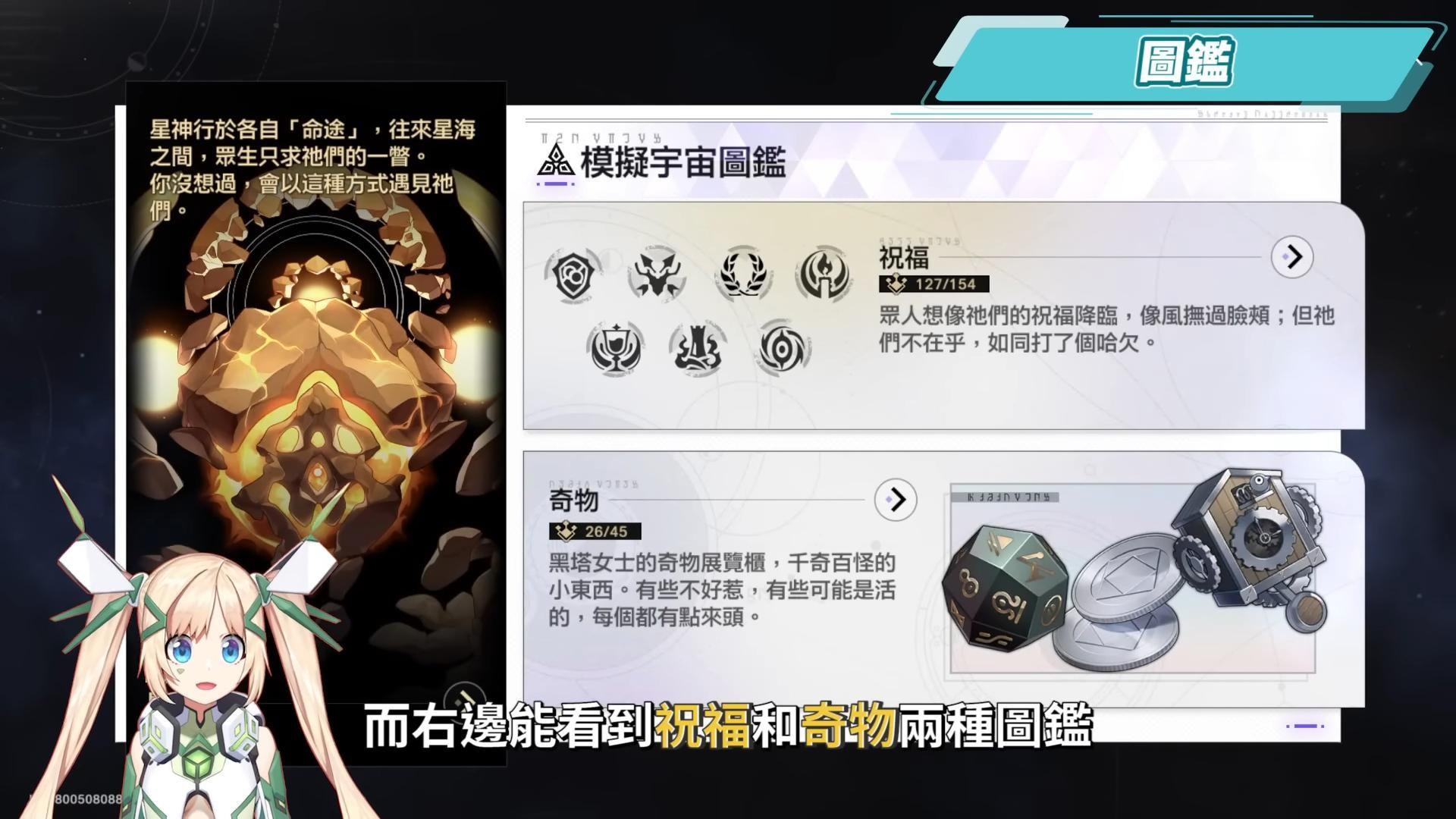 接著可以在圖鑑看到七種命途的星神介紹,而右邊能看到祝福和奇物兩種圖鑑,一個命途的祝福全部蒐集到後就能獲得共320星瓊,總共有七個體系,而奇物只要發現一個新的就能獲得30星瓊,總共有45種奇物。