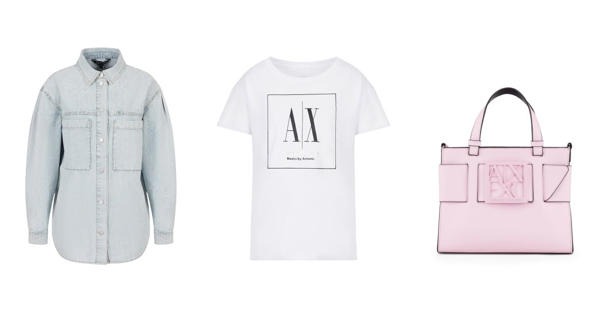 AX Armani Exchange淺藍色丹寧襯衫NT.7,680、AX Armani Exchange「Basics By Armani」系列白色T恤 NT.2,980、AX Armani Exchange粉色肩背提包 NT.7,780