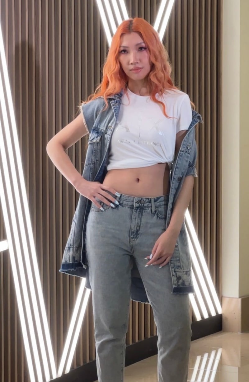 而近期正在準備個人演唱會的Karencici,身上的丹寧造型則是偏向流行街頭的穿搭風格,將上身穿的Basic by Armani短袖T恤,收緊打結後變成短版上衣,露出纖細腰身,直呼「這樣很辣!」推薦妞妞們在今年夏天也可以嘗試這樣的造型「清涼一下」~
