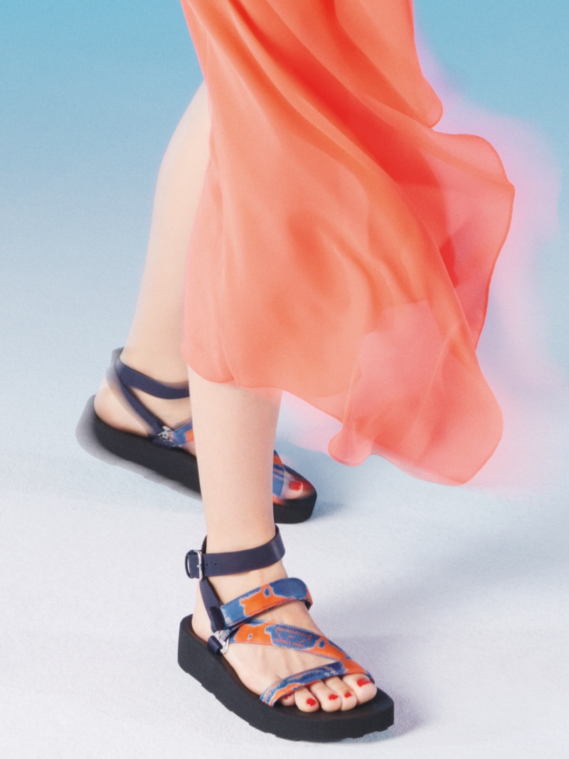 原來絲巾也能做成涼鞋!把小牛皮與真絲面料做材質上的混搭,更把運動感的元素也帶了進來,運動鞋底的配置,讓人走起來路來更舒適,搭配上真絲上的渲染色彩,時髦蜈蚣怎麼能全身而退不動心?(價格:NT$29,100)