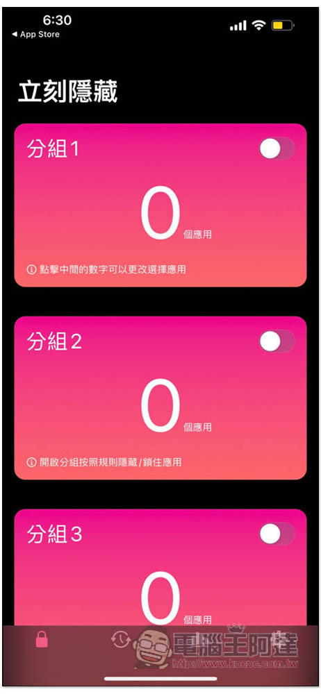 使用方法也很簡單,如果你是要立刻隱藏,手動啟用和隱藏 App 的話,進到第一個「立刻隱藏」選單,有提供多個分組,看你要用哪一個,我示範用第一個「分組 1」: