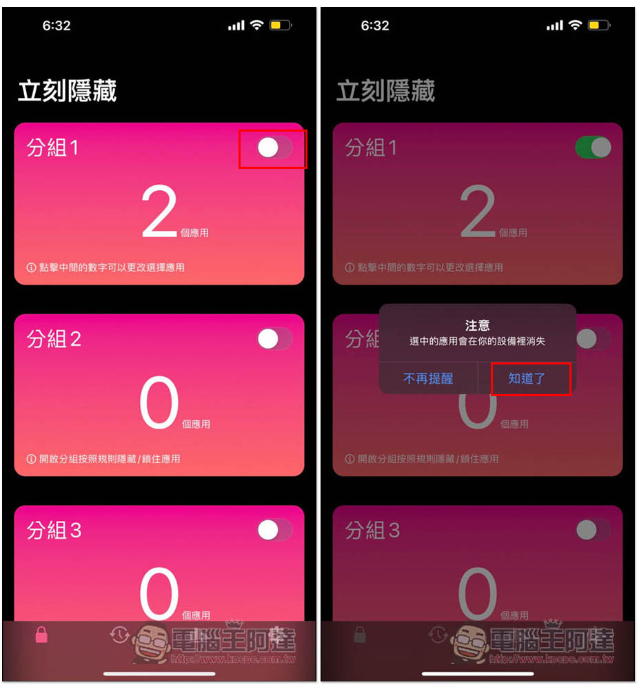 這幾個 App 就會加入到這個分組,然後打開右上角的開關,會跳出「注意,選中的應用會再你的設備裡消失」,按知道了。這邊也提醒一下,消失不代表移除,還是在你的 iPhone 裡,只是暫時不能用而已,要使用時需要把開關關掉: