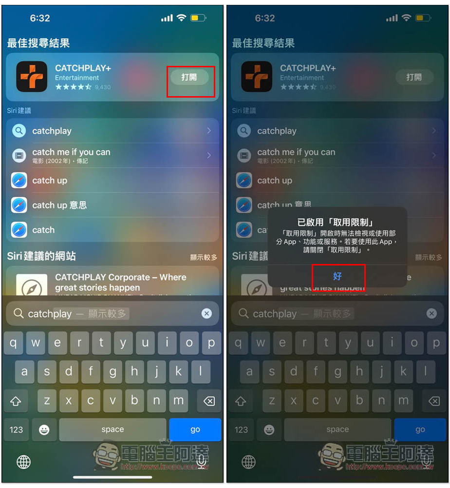 我嘗試用 Spotlight 搜尋,可以找到 App Store 的打開選項,但點擊後會出現已啟用取用限制,沒辦法使用: