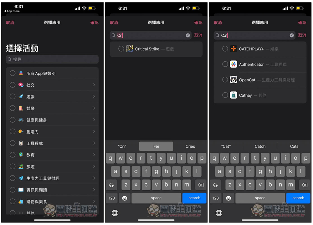 進到分組選單後,就能尋找你要隱藏的 Apps 了,建議用搜尋關鍵字的方式比較容易。打勾所有你要隱藏的 App 後,按右上角確認: