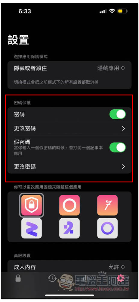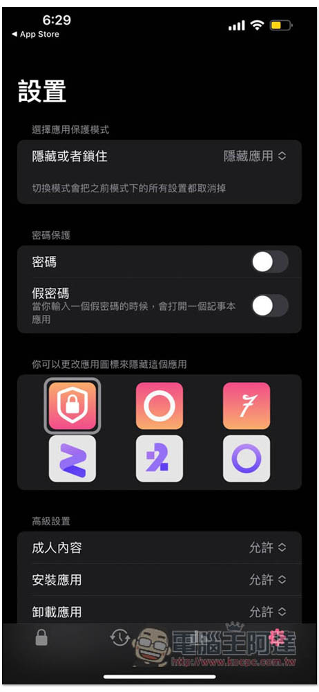 還有密碼保護,不僅能設定進入這 App 的密碼,還可以指定一個假密碼,來打開記事本應用,這樣被人要求打開這 App 時,就能假裝是記事本 App: