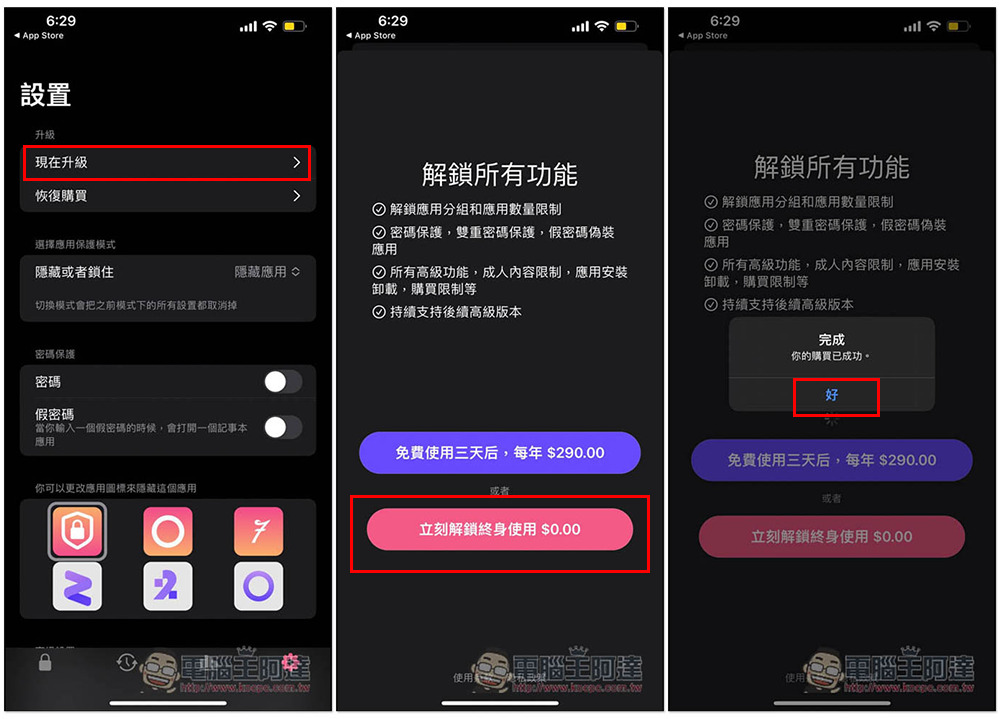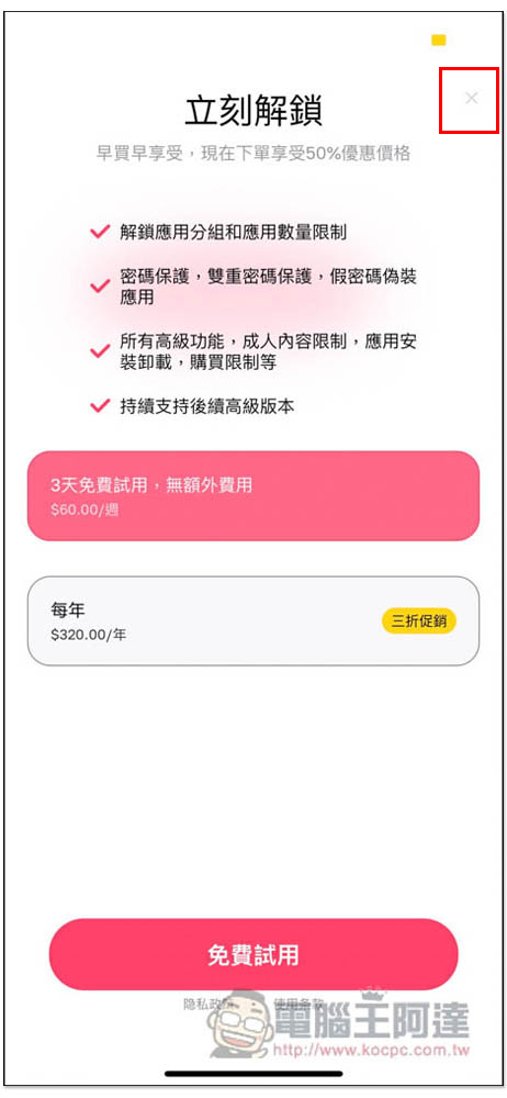 AALocker 的隱藏功能其實就是搭配 iPhone 螢幕使用時間來實現,因此不是什麼破解,可以放心使用,不過是中國開發者,擔心安全性的人還是建議跳過。另外終身版限免活動已經持續幾天了,不確定什麼時候會停止,建議下載好後趕快先拿終身版優惠: