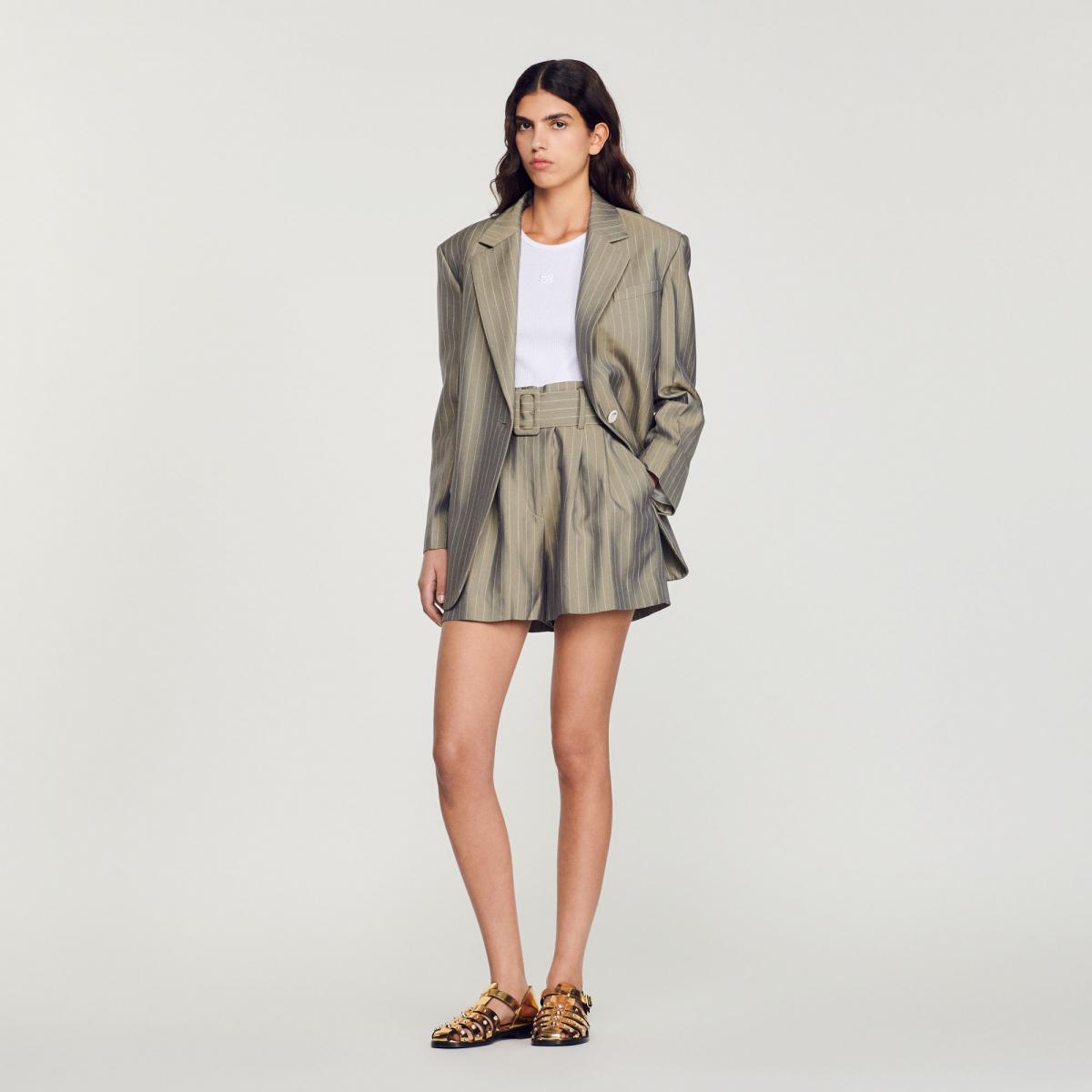 如果基本款的單色系西裝已經好幾件,那麽儂編很推薦入手條紋西裝,多了一分層次感,帶灰調的棕色系,搭配同材質的腰封短褲,在俐落之中多了一份隨性感,更可以因應場合,換上比如樂福鞋或尖頭高跟鞋來平衡休閒感。(價格店洽)
