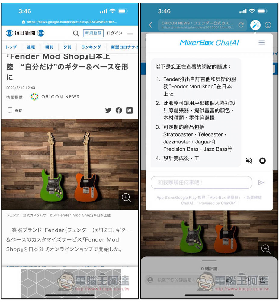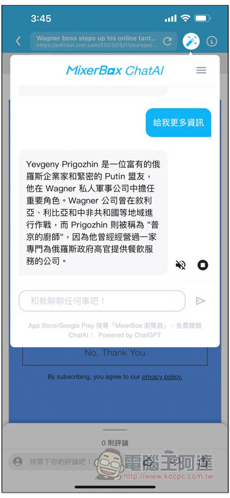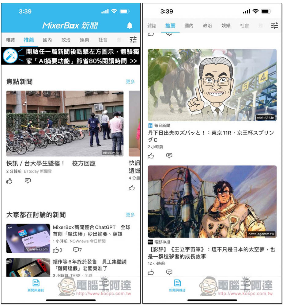 先前我們曾介紹過可以擷取文章摘要的 ReaderGPT 工具,這是瀏覽器擴充功能,對於手機用戶來說就沒辦法用,雖然也能自己把整篇文章複製到 ChatGPT 整理摘要,但操作非常麻煩,最近終於有開發商把摘要功能放入新聞 App 了!這款「MixerBox 新聞神器」就提供一鍵 AI 摘要功能,而且也是使用 ChatGPT,國內外新聞都支援,國外新聞還會用繁體中文回覆,這非常不錯,完全免費,iOS、Android 版都有,推薦給大家。