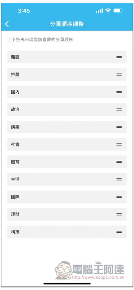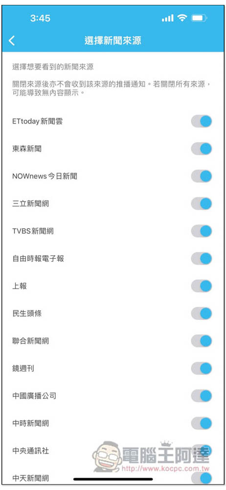 如果你有不想看的新聞來源,可至設定中把它關掉,預設是全部都打開: