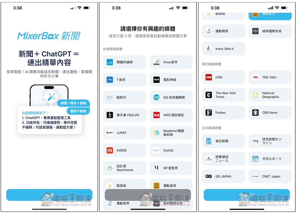 首次打開 MixerBox 新聞 App 時,會讓你選擇至少三個感興趣的媒體,國內外都有,這部分我測試不會影響什麼,只是確保你選擇的媒體新聞有出現在首頁就是,後續都能再更改。另外你可能會注意到,怎麼沒有各大新聞媒體?事實上是有的,這邊沒列出而已: