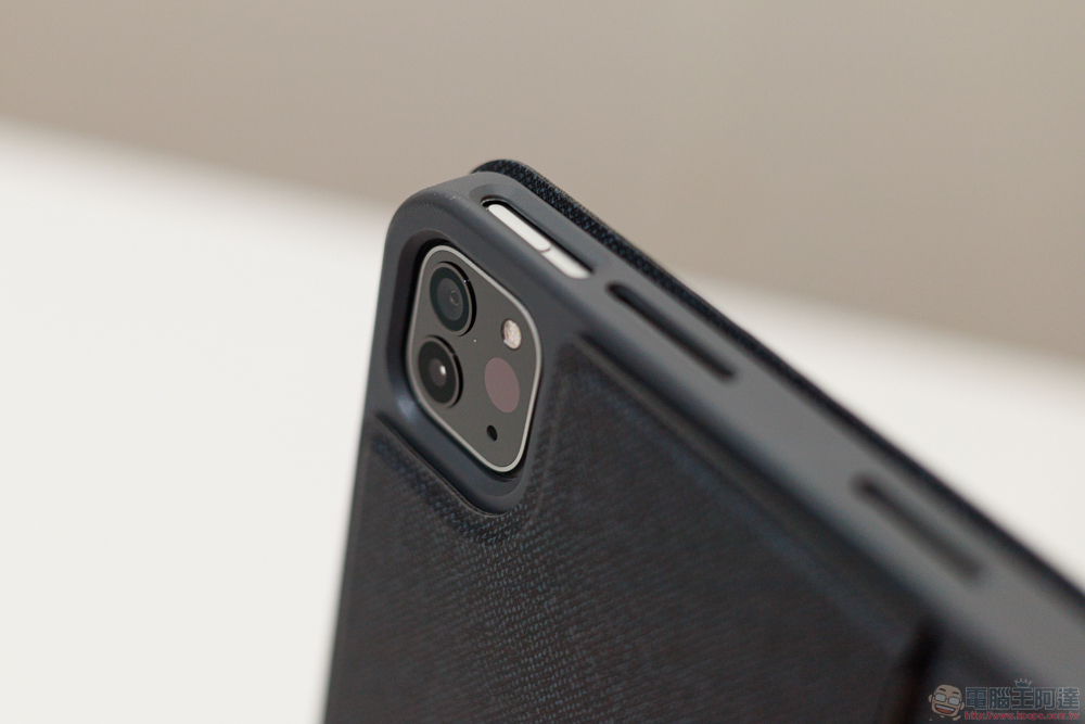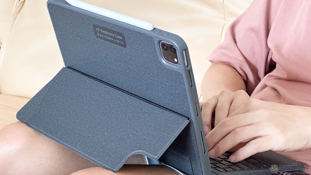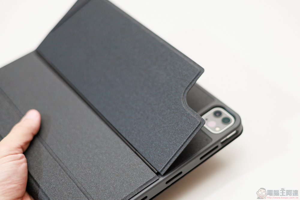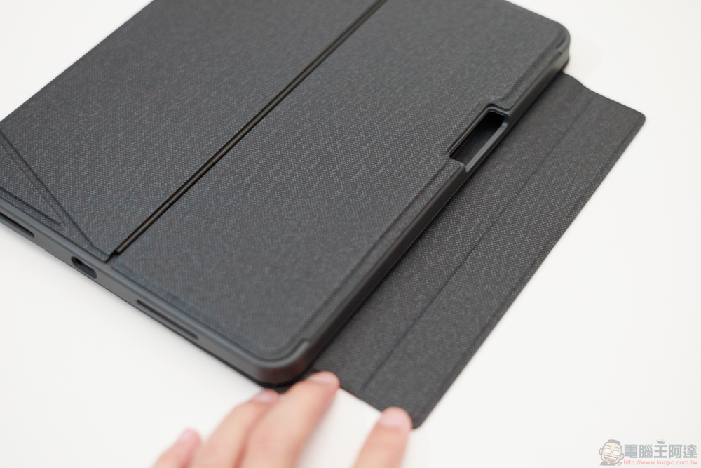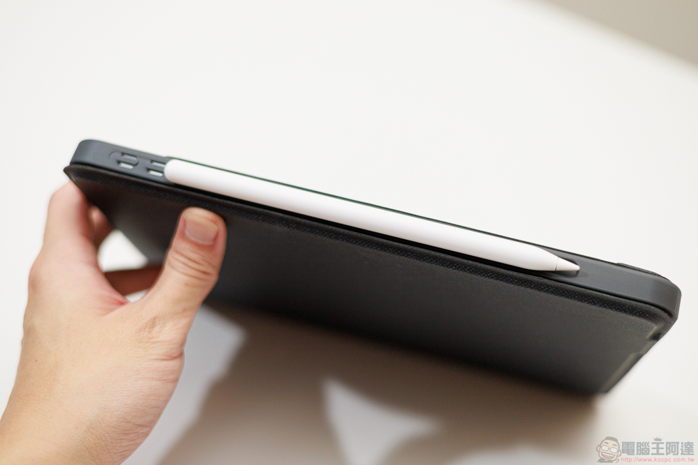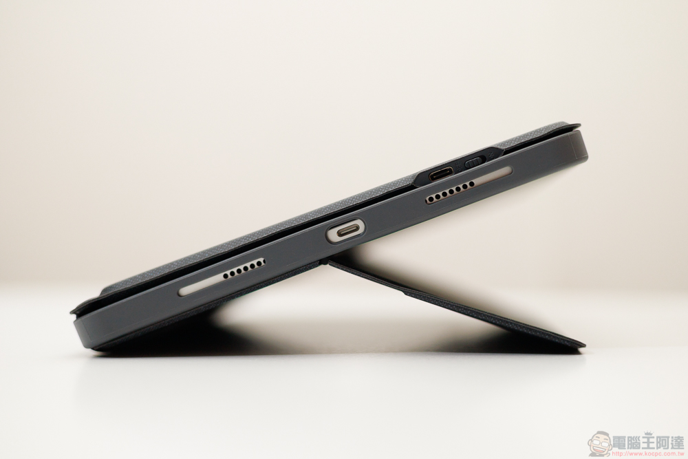 此一同時,它還提供了可以更安全收納的筆槽 - 這除了在立起來時,可以讓螢幕能更往上位移一些些視線更好外。也能兼顧 iPad(第十代)搭配原廠一代觸控筆的收納需求 - 雖然認真講,我們其實比較推薦用通用性更高的 eiP Pencil。畢竟真的很超值好用啊!:
