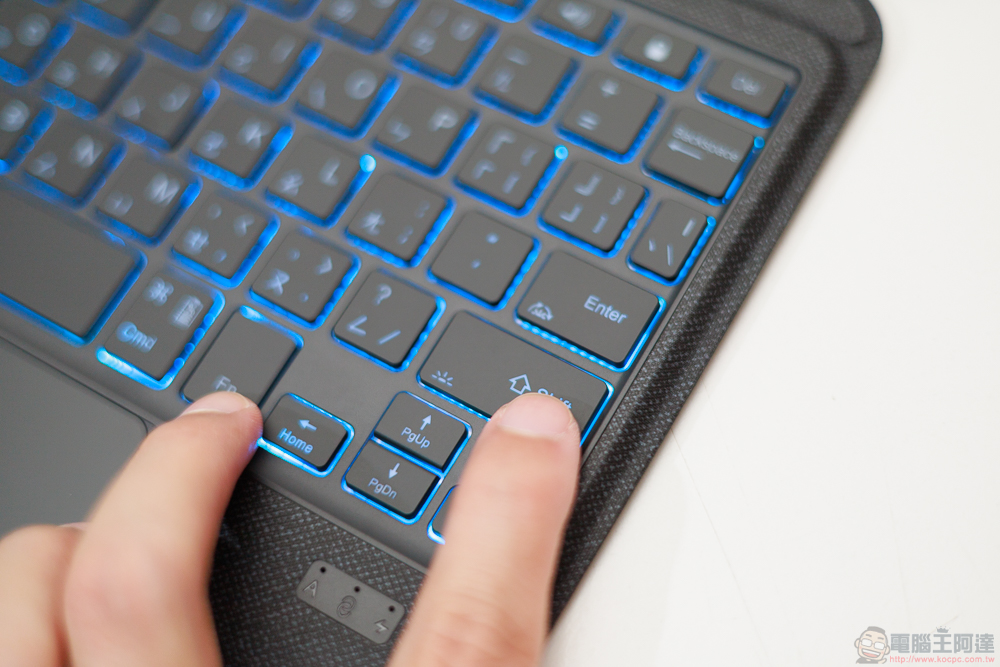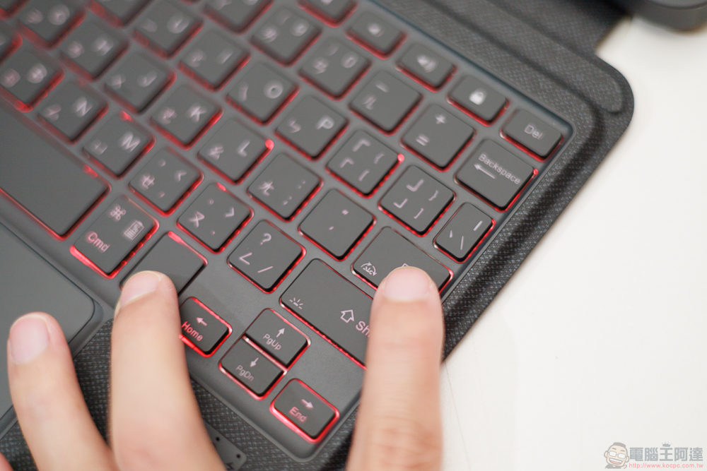 背光切換方式只需要簡單以 Fn 鍵搭配 Enter 鍵即可調整;右側的 Shift / CMD + Fn 則是背光亮度/查看電池狀態;配對是 C + Fn,還可以透過 Fn + Space 快速關閉觸控板 - 有搭配滑鼠使用的話相當好用: