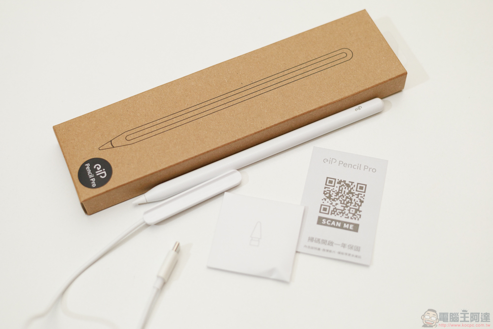 可以看到產品保固(這麼超值的價格還有一年保固!)與說明都更環保的改採掃描 QR Code 的方式處理,還有一個備用的筆尖(與 Apple Pencil 2 通用唷!):