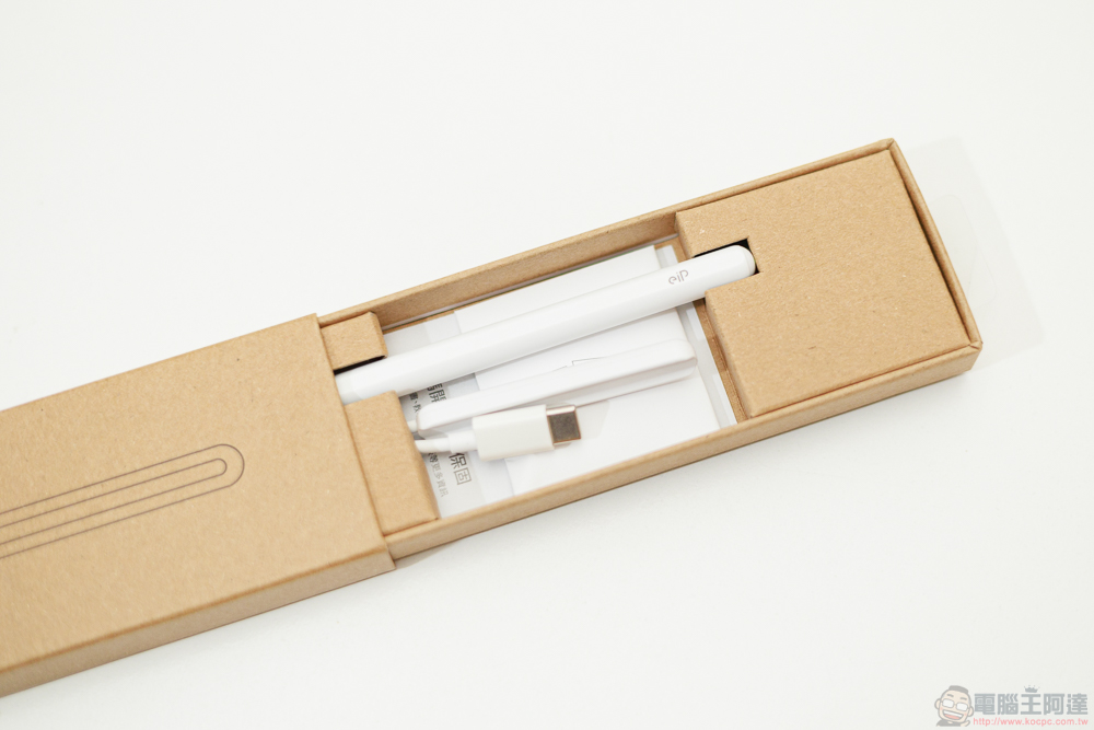 這次 eiP Pencil Pro 的特殊能力之一,是他們很神奇的達成,可以直接以 iPad Pro / iPad Air 側邊的觸控筆磁吸位置進行充電的能力 - 就跟 Apple Pencil 一樣的使用體驗,還能自動開機超讚!原本還以為不會附上充電線了。殊不知居然看到了這個有趣的配件: