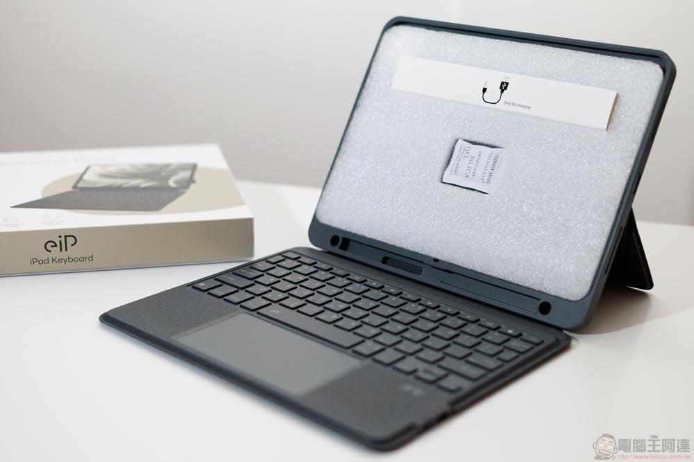eiP Magnetix 磁吸可拆式藍牙鍵盤展開之後,可以發現充電線配件已經附在 iPad 的安裝位置: