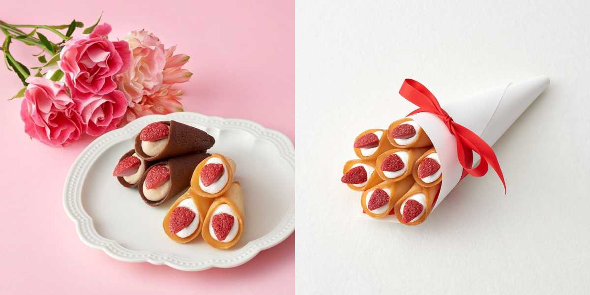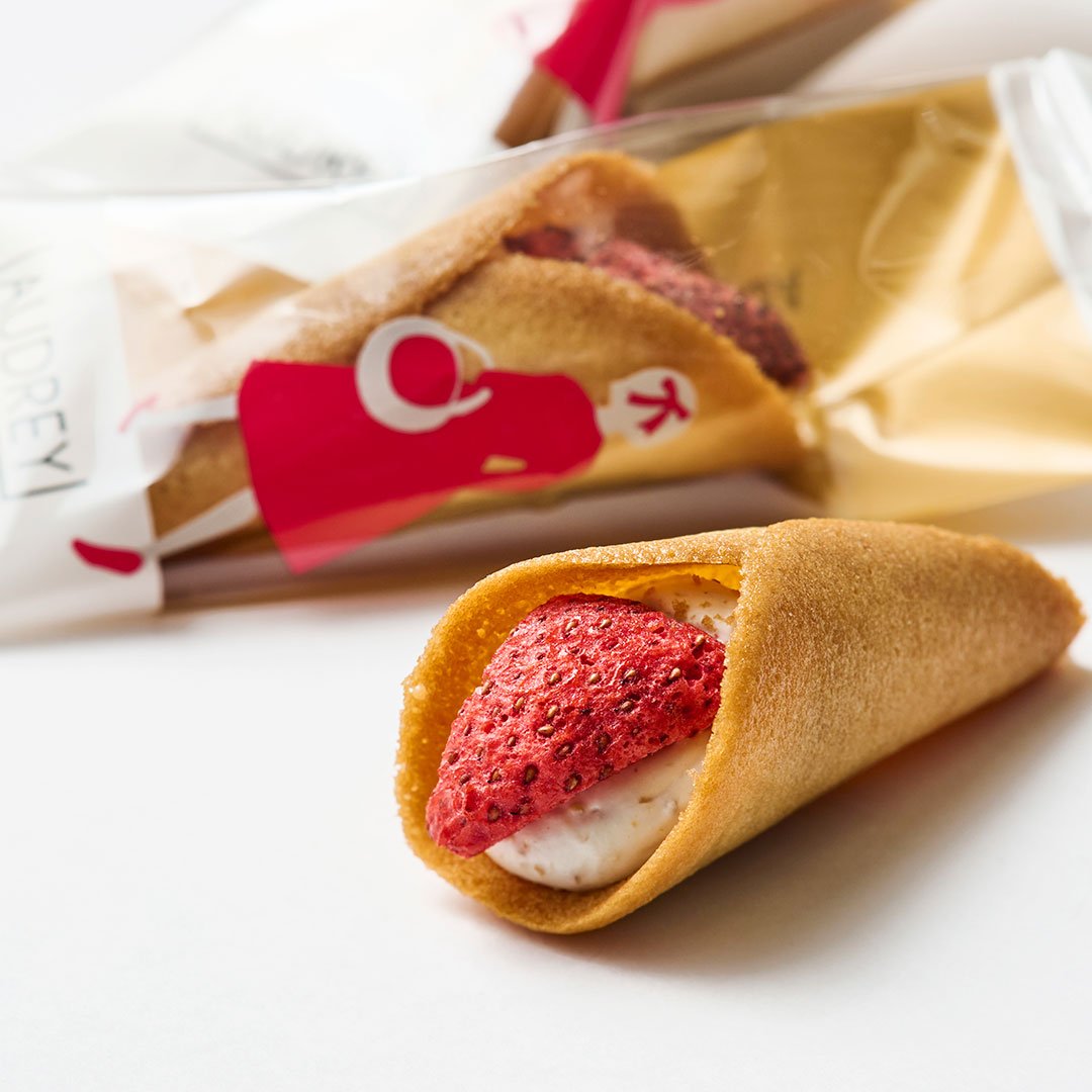 送給女生朋友最適合不過的「AUDREY」,以可愛簡約的手繪線條風格包裝,牢牢抓住眾人的少女心!形狀宛如紀念日花束的「草莓花束餅乾」,使用北海道生產的白巧克力奶油,搭配酸甜的草莓乾,包覆在薄脆的餅乾中,讓人一吃就能嚐到入口即化的滋味。
