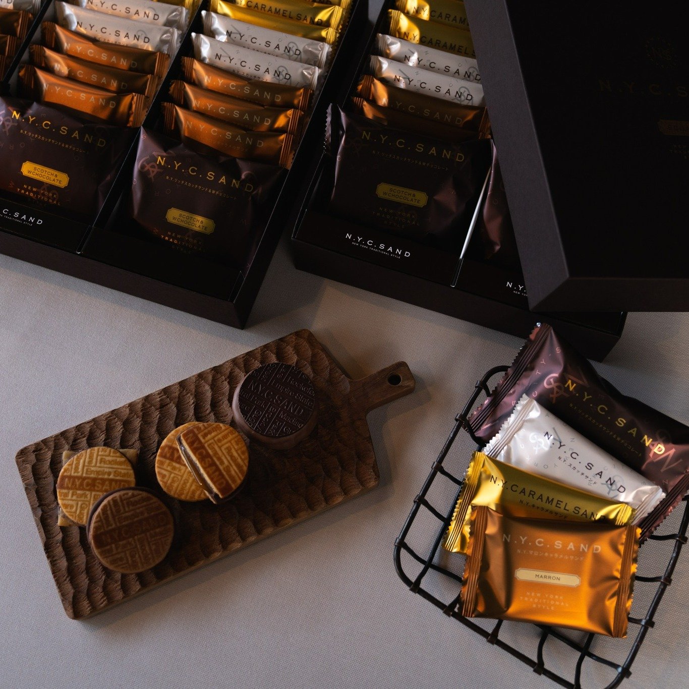被譽為日本最搶手伴手禮之一的「N.Y.C SAND」,是以紐約知名的ハバナサンド(Habana sand)為基礎開發,店內經典的「巧克力焦糖夾心餅乾」使用鮮奶油和黑糖烹製的焦糖,並包裹在巧克力的糖皮中,外層再由「N.Y.C SAND」標誌餅乾包住,三種層次營造出美味和諧的口感!另外根據季節還會推出「季節限定」的商品喔~