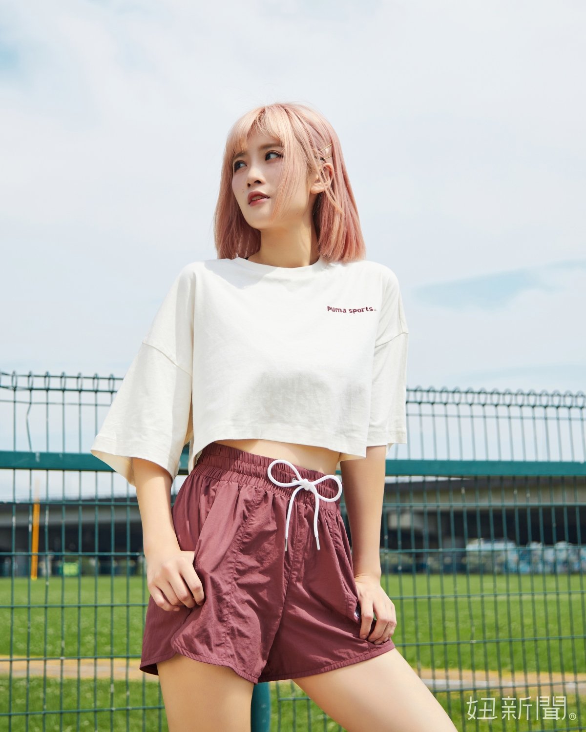 木紫色短風褲搭配米色PUMA TEAM短袖T恤也是個不錯的選擇,略帶寬鬆的短版俐落剪裁再加上胸前puma字樣,在率性氛圍中多加了一點可愛小清新,背後鏤空的puma sports字樣元素更是復古氣息拉滿,時尚設計感滿分!