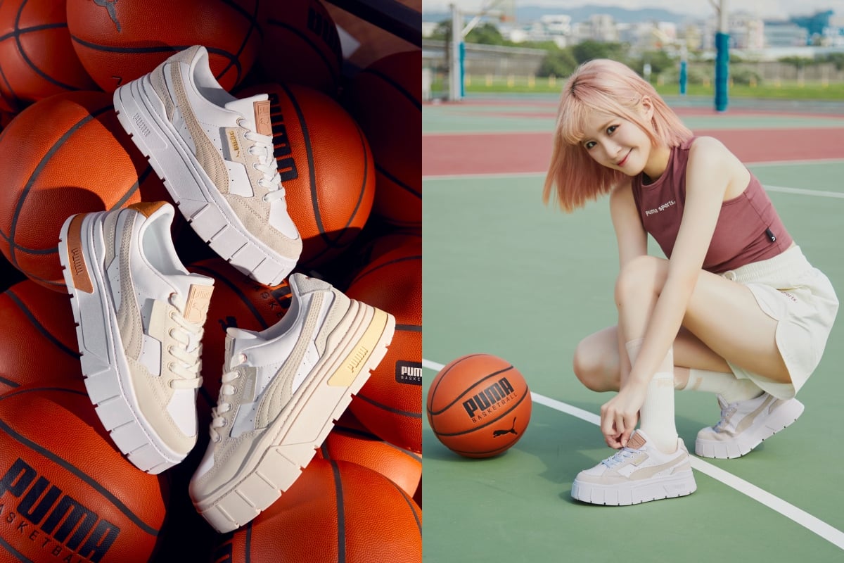 鞋款則適合搭配深受女孩喜愛的PUMA Mayze Stack鋸齒厚底妹子鞋,超高刻痕厚底與純白皮革&米色麂皮異材質巧妙拼接配色,將甜美與個性完美混搭,是打造甜酷風格穿搭最不可或缺的一樣單品,整體帥氣感upup!甜酷辣妹就此誕生~