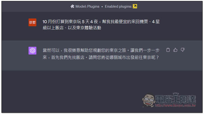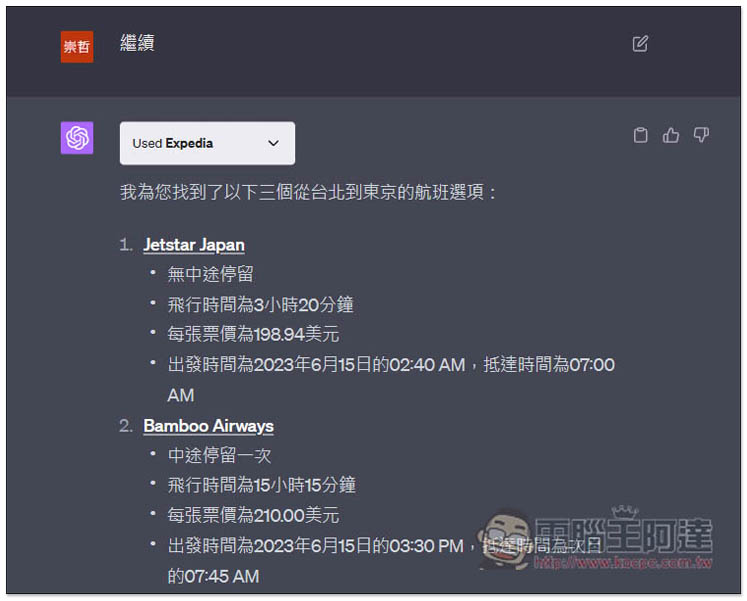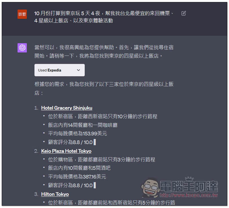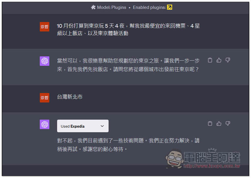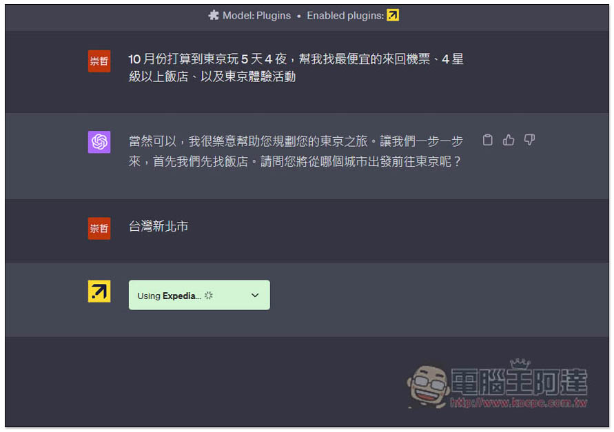 不知道是 ChatGPT 問題,還是 Expedia 外掛沒寫好,現在給的答案都只有一種,所以現在對 ChatGPT Plugins 不要有太大期待就是。