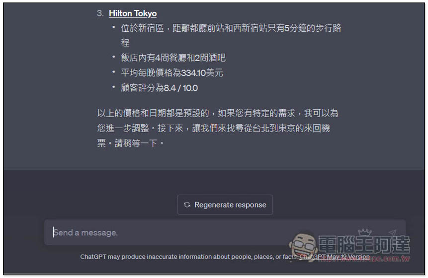 隨後我把問題加上台北之後,獲得的答案就比較精準,像 ChatGPT 會直接透過 Expedia 外掛搜尋,並直接給我答案,首先是三間推薦的飯店: