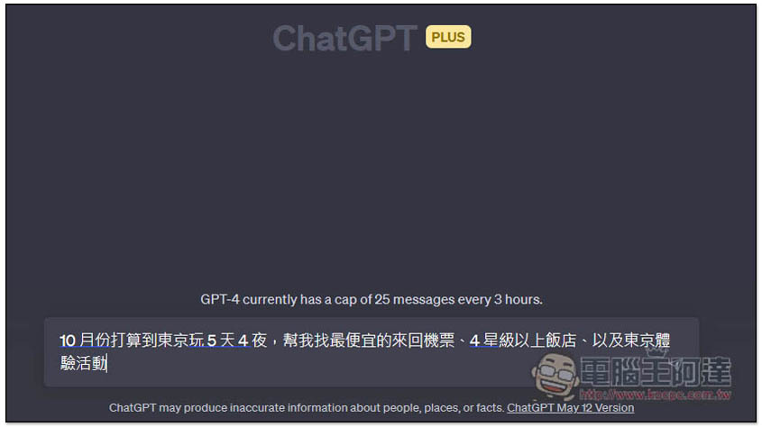 輸入你要問的問題,像我問:「10 月份打算到東京玩 5 天 4 夜,幫我找最便宜的來回機票,4 星級以上飯店,以及東京體驗活動」: