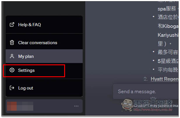 ChatGPT Plus 會員打開 ChatGPT 聊天室後,點擊左下角的 Settings 設定選項: