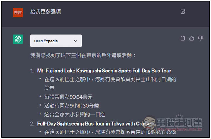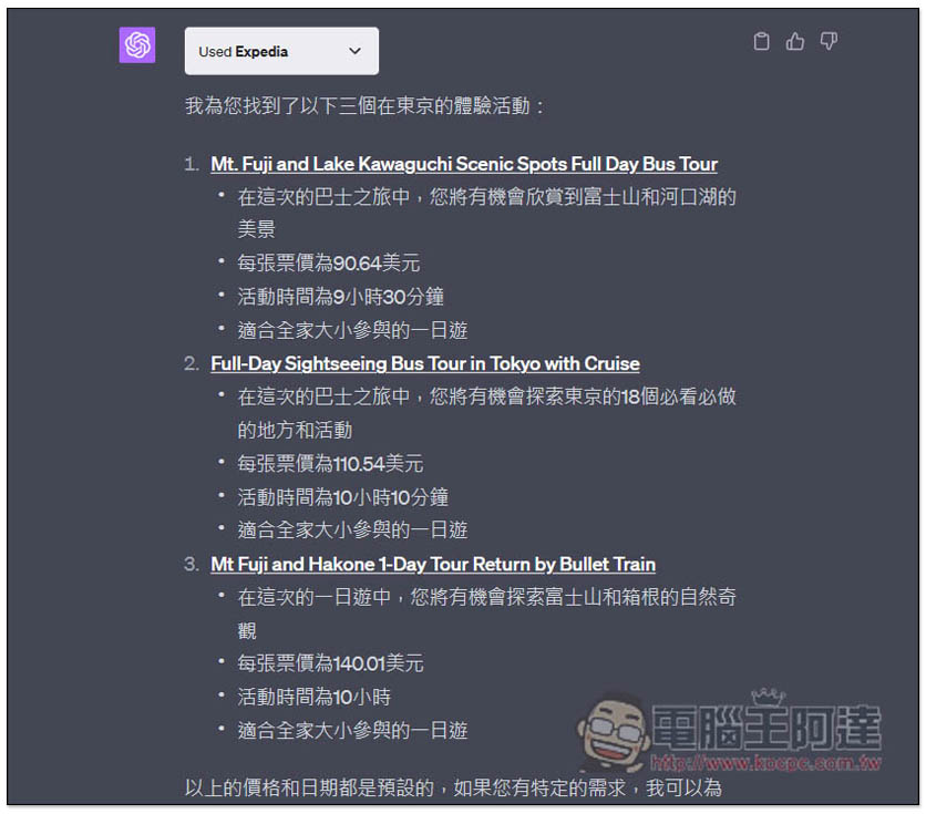 另外我還發現到,下圖是 ChatGPT 透過 Expedia 找出的三個推薦東京體驗活動,我覺得太少,而且都是看風景: