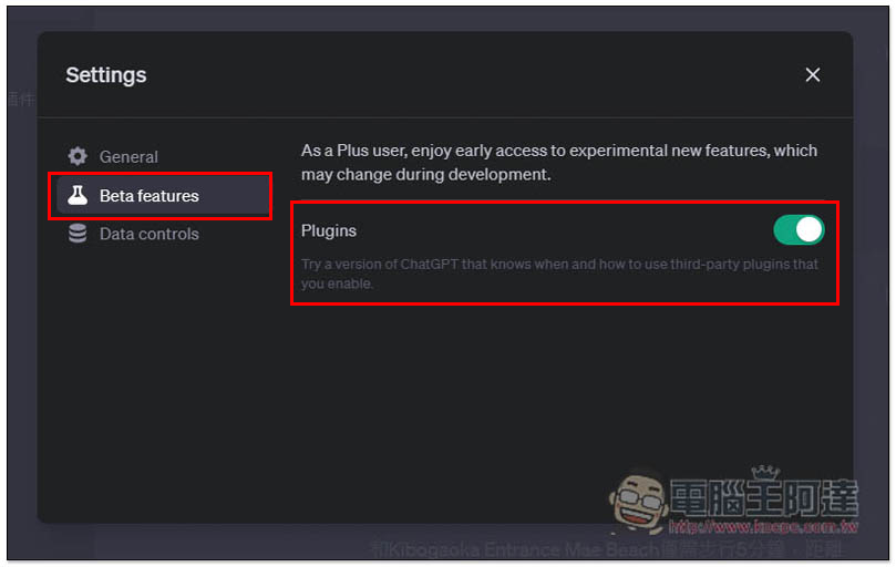 接著就會看到全新的「Beta features」選項,裡面就有 Plugins 外掛功能,將它開啟即可。如果你夠幸運,也可能同步看到 Web Browsing 功能選項,有的話也能同步打開來體驗 ChatGPT 網頁瀏覽功能: