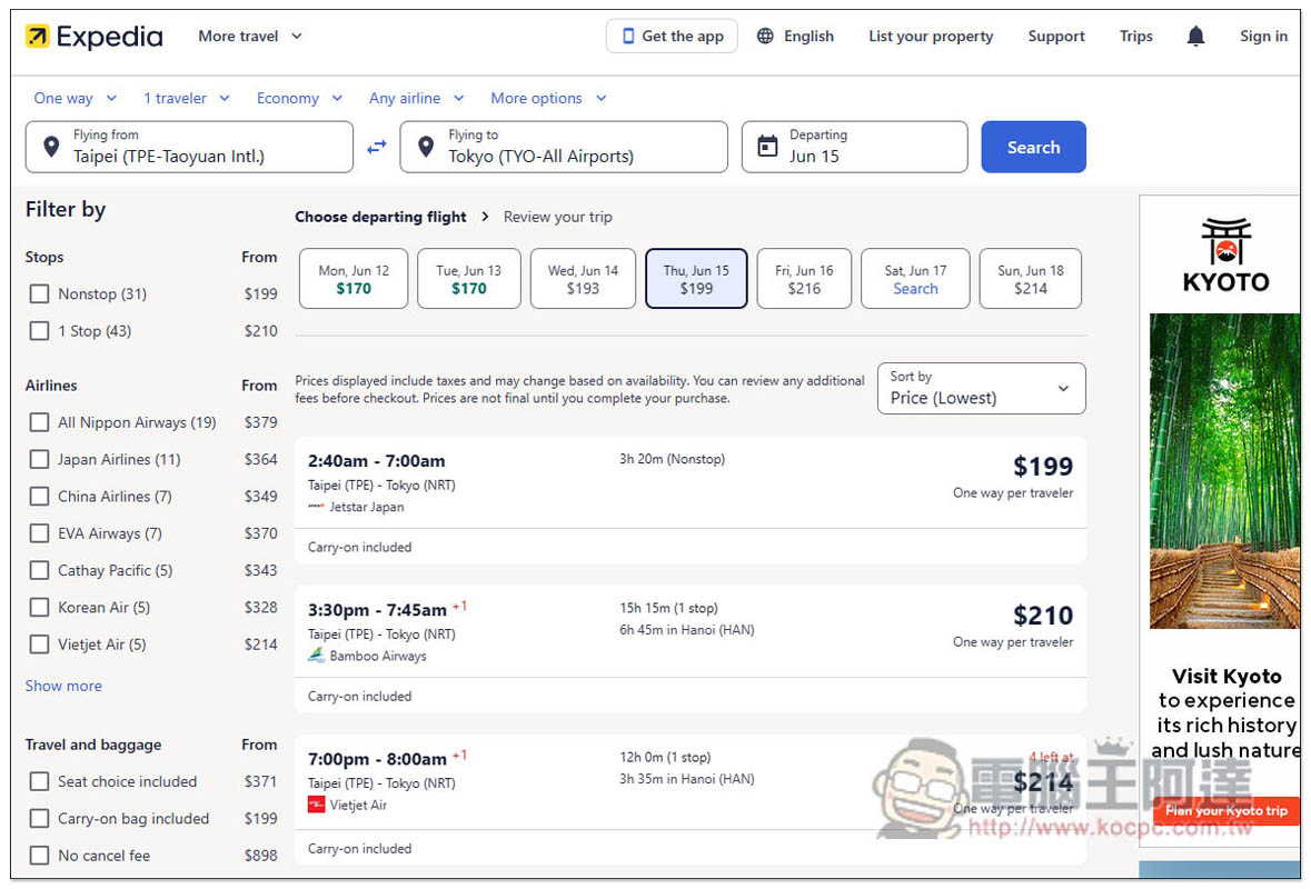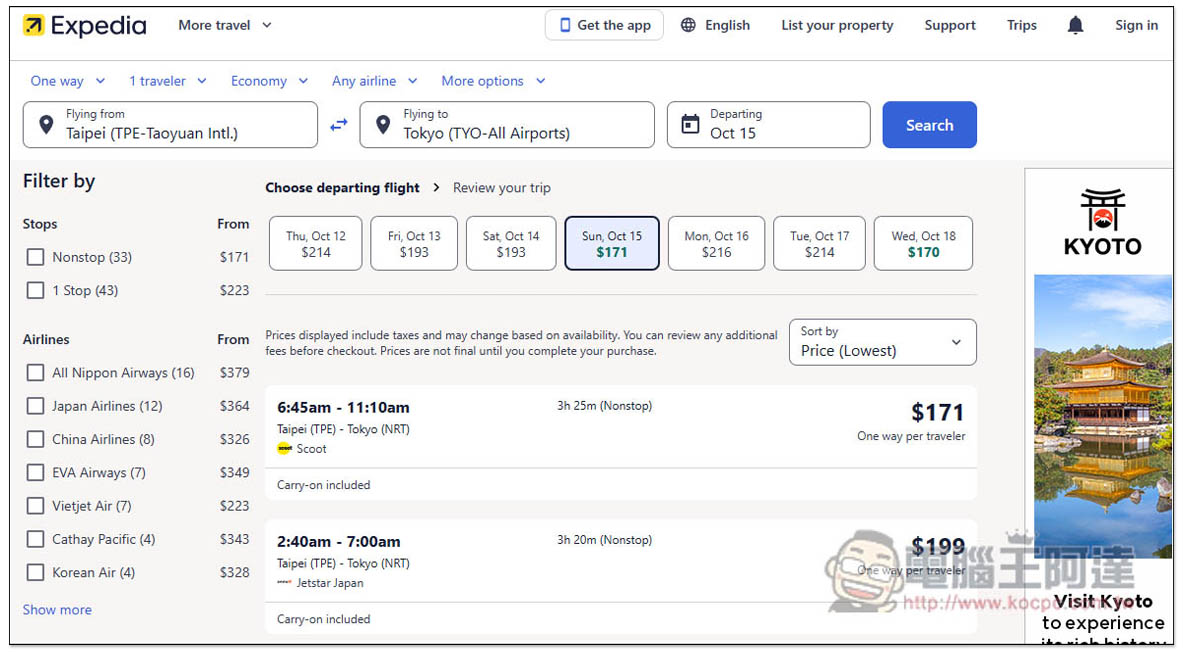 我手動改日期變成 10/15,沒想到其實有更便宜的 171 美金機票,航空公司是 Scoot: