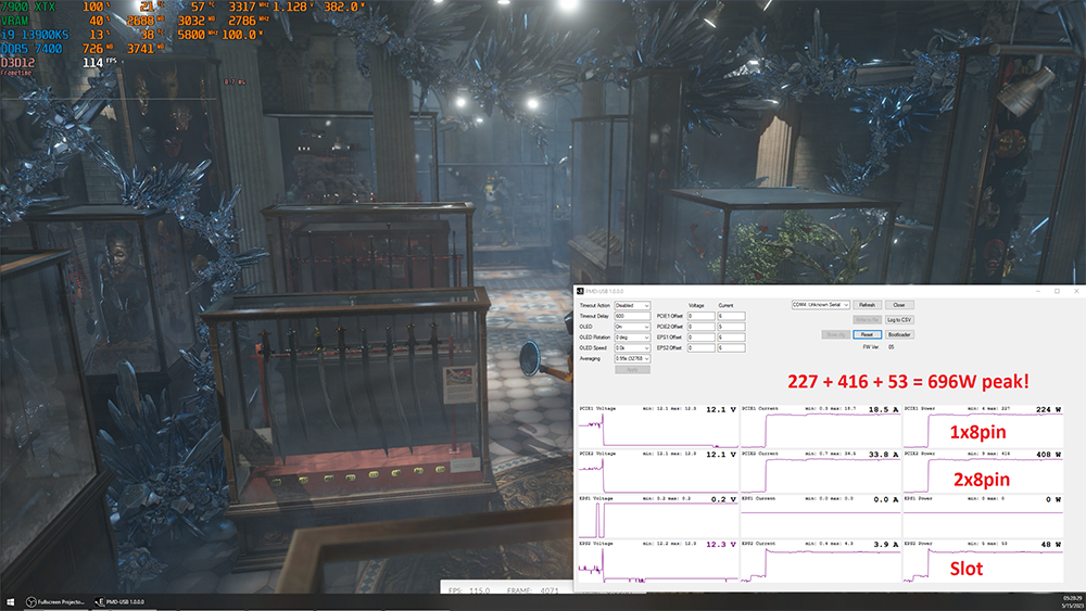 既然時脈拉這麼高,不意外的功耗也超級高,達到 696W,快 700W,這幾乎是預設 TBP 的 355W 二倍,真的誇張,不過這應該也只能拿來跑分,長時間功耗都這麼高,應該會蠻危險的,對顯卡本身也不太好: