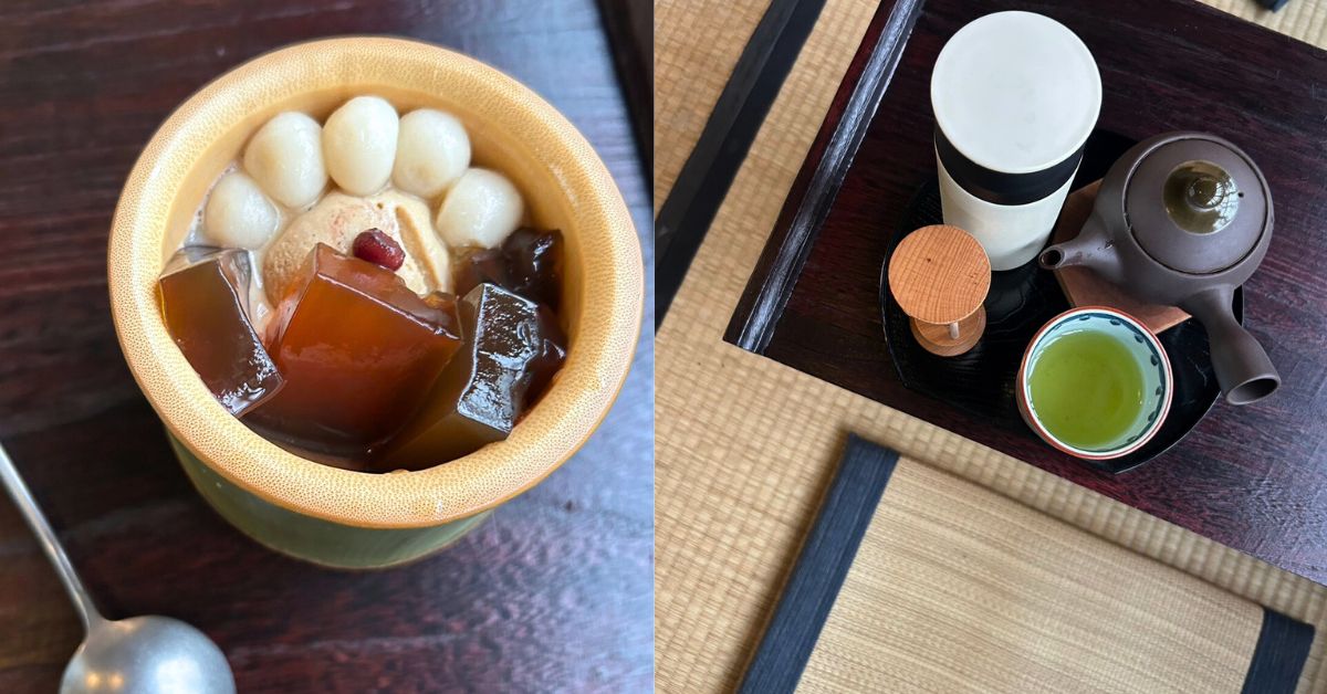 菜單以和菓子和茶飲為主,還有宇治金時、茶類冰淇淋等甜點,鹹食也有紫蘇飯糰、烏龍麵等選擇。可惜當天吃牛肉湯吃得太飽了,就專攻茶飲和甜點了。點了一壺玉露冷茶和焙茶聖代,茶飲附上一個冰水保溫杯,可以回沖個三次左右,玉露清香,雖然不是很懂得品茶,但好喝這點是沒有錯的。焙茶聖代很驚豔,冰淇淋非常濃郁,濃縮了焙茶香氣卻不甜膩,質地有一種沙沙的顆粒感,苦甜苦甜又回甘,搭配小湯圓和茶凍好吃到忘我,一口一口一下就挖光了。